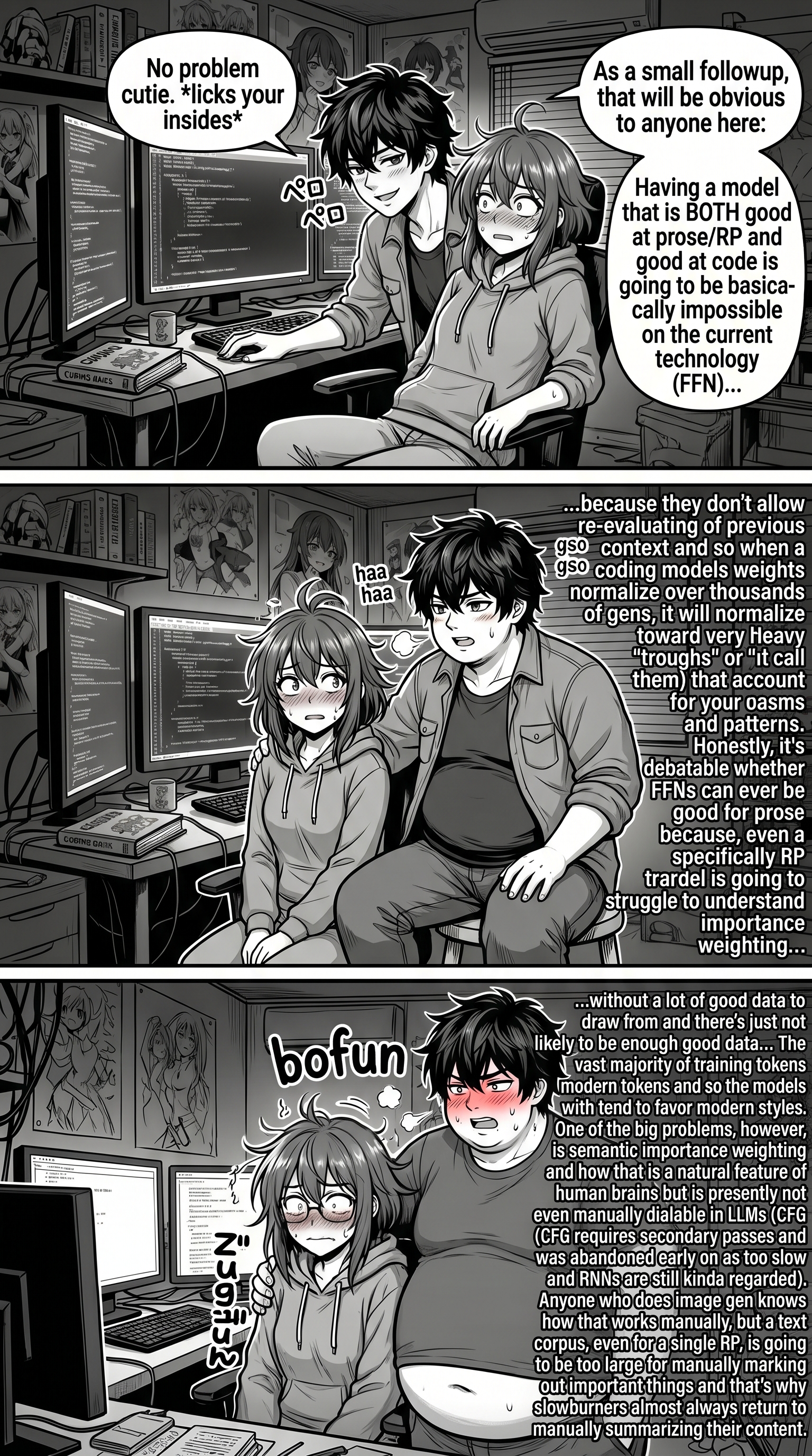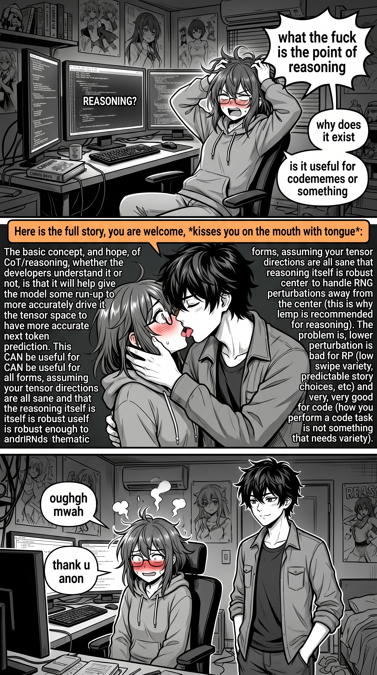 >>564699615Here is the full story, you are welcome, *kisses you on the mouth with tongue*:The basic concept, and hope, of CoT/reasoning, whether the developers understand it or not, is that it will help give the model some run-up to more accurately drive it into the right area of the tensor space to have more accurate next token prediction.This CAN be useful for all forms, assuming your tensor directions are all sane and that the reasoning itself is robust enough to handle RNG perturbations away from the center (this is why lower temp is recommended for reasoning). The problem is, lower perturbation is bad for RP (low swipe variety, predictable story choices, etc) and very, very good for code (how you perform a code task is not something that needs variety).