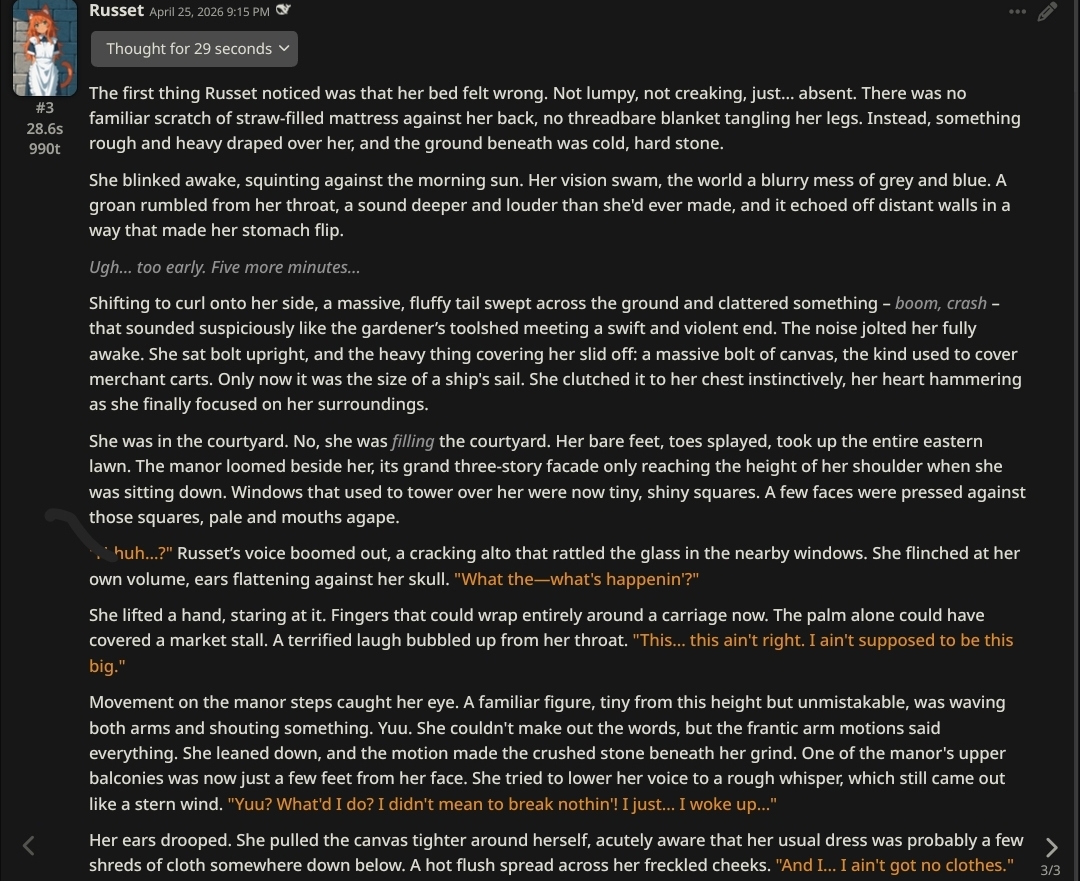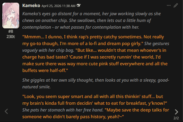 /aicg/ - A general dedicated to the discussion and development of AI chatbots#790 - Rats with Hats Edition▶https://rentry.org/aicg_vg_memo▶This general is for discussion of the interactive experiences you can build on top of AI chatbots.>NewsDeepseek V4 https://huggingface.co/deepseek-ai/DeepSeek-V4-Pro/blob/main/DeepSeek_V4.pdfGPT-5.5 https://openai.com/index/introducing-gpt-5-5Kimi K2.6 https://www.kimi.com/blog/kimi-k2-6Claude Opus 4.7 https://www.anthropic.com/news/claude-opus-4-7GPT-5.4 https://openai.com/index/introducing-gpt-5-4additional info: https://aicg.neocities.org/info>FrontendsSillyTavern: https://docs.sillytavern.appRisuAI: https://risuai.netAgnai: https://agnai.chat | https://rentry.org/agnai_guides_>Botshttps://characterhub.org | https://chub.aihttps://realm.risuai.nethttps://partyintheanchorhold.neocities.orghttps://aicg.neocities.org/bots>Modelsjailbreaks: https://rentry.org/jb-listinggpt: https://platform.openai.com/playground | https://platform.openai.com/docsclaude: https://console.anthropic.com | https://docs.anthropic.com | https://rentry.org/how2claudegemini: https://gemini.google.com | https://ai.google.dev/docs | https://rentry.org/gemini-qrdeepseek: https://chat.deepseek.com | https://api-docs.deepseek.comlocal: >>>/g/lmg | https://aicg.neocities.org/local | https://openrouter.ai>Botmakinghttps://aicg.neocities.org/botmakinghttps://desune.moe/aicharedhttps://agnai.chat/editor>MetaOP templates: https://rentry.org/vgOP | https://rentry.org/aicgOPaicg botmaking events: https://aicg.neocities.org/eventslore: https://rentry.org/aicg_chroniclesrice: https://aicg.neocities.org/ricingservices assessment: https://rentry.org/aicg_metalogs: https://sprites.neocities.org/l/r | https://chatlogs.neocities.orgprev: >>564614376
