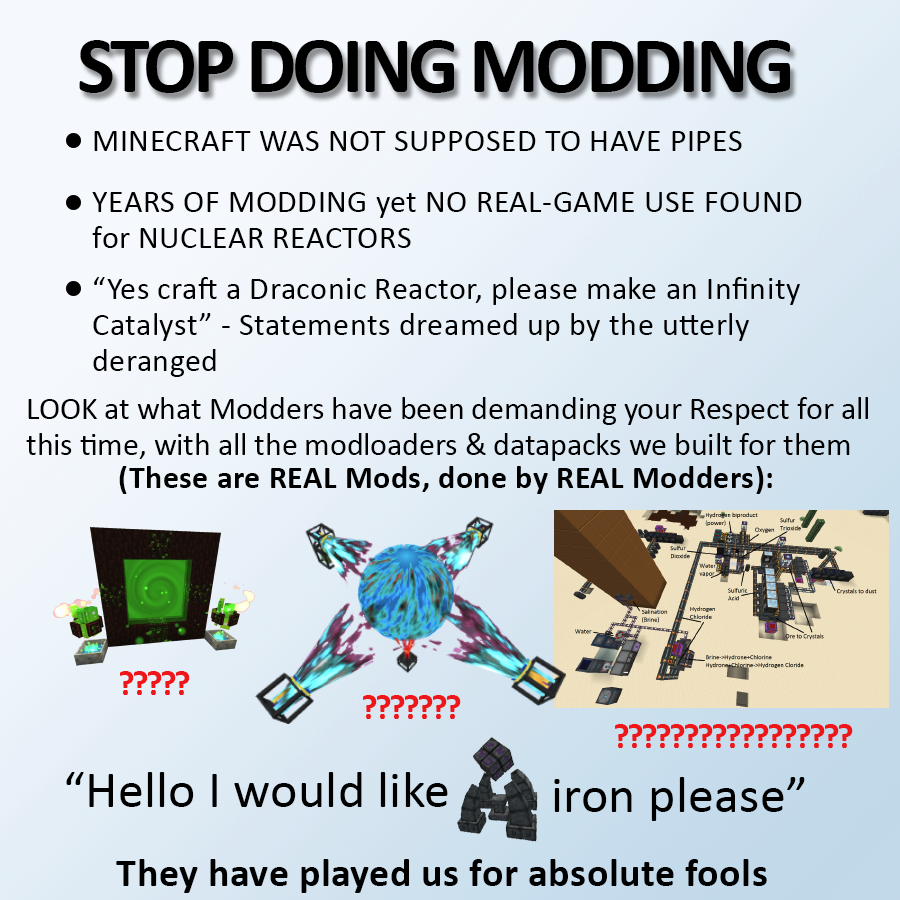 >modpage looks normal>download mod>mental illness was hidden to not scare off normal people>seethe uncontrollably when people try to remove it