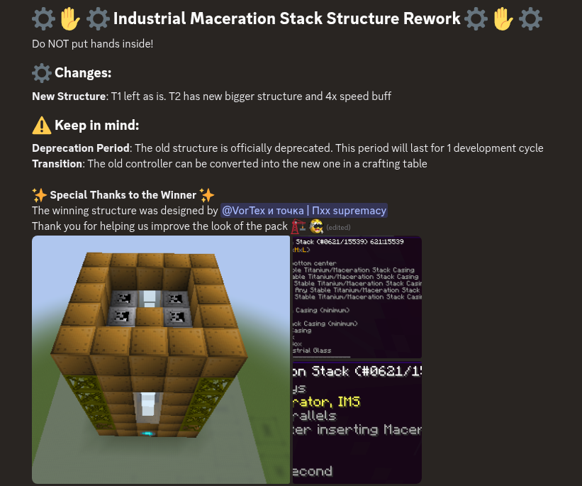 >>564697646My own tech mod which will never be properly implemented and released and currently exists only in my mind and as a bunch of disjointed chunks of code on my gitThe gist of it is that it's essentially a magic mod disguised as sci-fi tech mod. Remnants of a Precursor civilization's tech are scattered in the world, you have to travel and find their dilapidated machines and mechanisms, break them apart, salvage whatever you can and try to reverse-engineer it. I envisioned two tiers: first tier is your crude attempts at imitating Precursor tech, substituting their post-scarcity era materials and manufacturing processes with steel, duct tape and determination; second tier is you having both original blueprints (reverse-engineered or looted) and sufficiently-close-to-original materials and assembling things that are basically temu Precursor tech, almost as good as the real thing. There's also a bonus third tier which is made up of actual Precursor stuff made by themselves that miraculously survived to this day, but these are uncraftable and can only be found as rare loot.There are no processing lines, there's no electricity or its equivalent to generate and store, and in general you never need to have something running in the background at all times, things only happen when you manually request them to happen. Every single machine is a futuristic multiblock that directly affects the world around it in some way (with emphasis on militaristic usage), and there are no machines that serve no purpose other than just crafting intermediate parts for other machines. It's almost an anti techmod in that regard, deliberately avoiding classic techmod gameplay loops.I'll totally re-start working on it properly and get it done and released, very soon, any day now