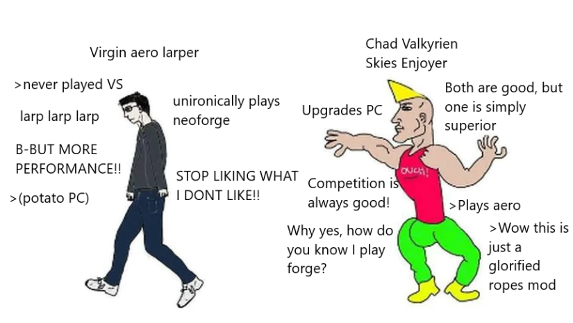 >>564878049Realistically? Not really anything outside their addon ecosystem and some extremely specific things.Of course, the VS devs will tell you that aero>has only marginally better performance, not because of aero team competence, but because of neoforge>has many of the same bugs as VS>has simplified physics>has a casualized building system>has physics that are too realistic>has a building system that can only handle big vehicles properly>license autism >worse for larger serbs (for some reason)>can't be compared to VS because aero is 1.0 and VS is only half-finishedAgain, outside some very specific examples aero is going to be head and shoulders better, anyone who's used both and doesn't have some weird shill complex will tell you that. I will say that as far as running a moddedserb is concerned you're probably better off with VS for the next six months while everyone chases 1.21. Not that I want to shit on the main devs like triode who have been pretty cool about the aero release, but the rest of their community is in fall of the reich mode and wants to ostracize anyone who just says aero is a plain improvement. I guess VS could pull ahead somehow, but they've had like 4-5 years and the added benefit of public testing and feedback. I think they need to prepare to be marginalized.