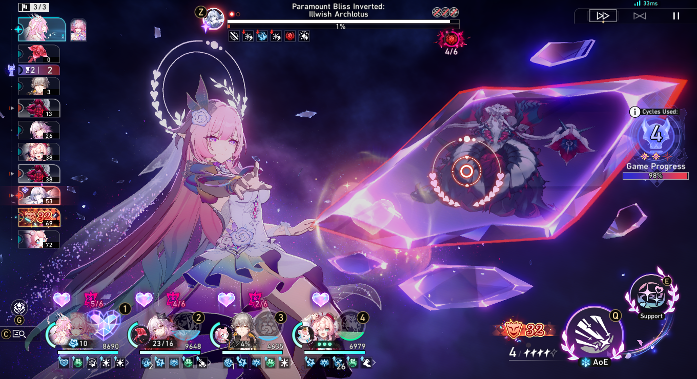 It has come to my attention that E6 Hyacine is so hilariously overtuned that she's actually more optimal in CW, doing billions by her third turn.
