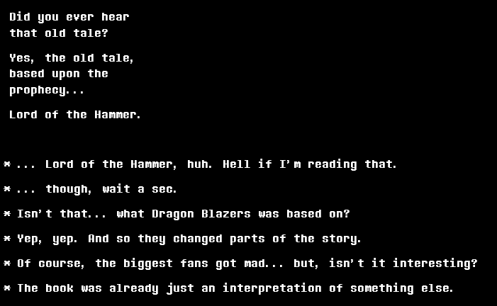>>564759338Toby has no obligation to write and include flavor text for Noelle interacting with every item in chapters 3 and 4, no obligation to write and include text every chapter that can only be seen by datamining and which gets quoted in the game itself, no obligation to include fun value events or the chapter 1 egg which are close to impossible to find without datamining, no obligation to reference a "dummied out" prophecy panel in a newsletter, and so on. Deltarune can be perfectly understood while ignoring all optional content like the Crystal bosses or eggs, yet those things still exist for people who seek them out and they are rewarded for doing so. It's the same with dataminable content. If he didn't want anyone to care about it, then it would be patched out or not included to begin with. It would certainly be faster, development-wise, if he didn't write special dataminable text that always gets translated the same as regular text. Deltarune is a work of metafiction and the medium itself matters.