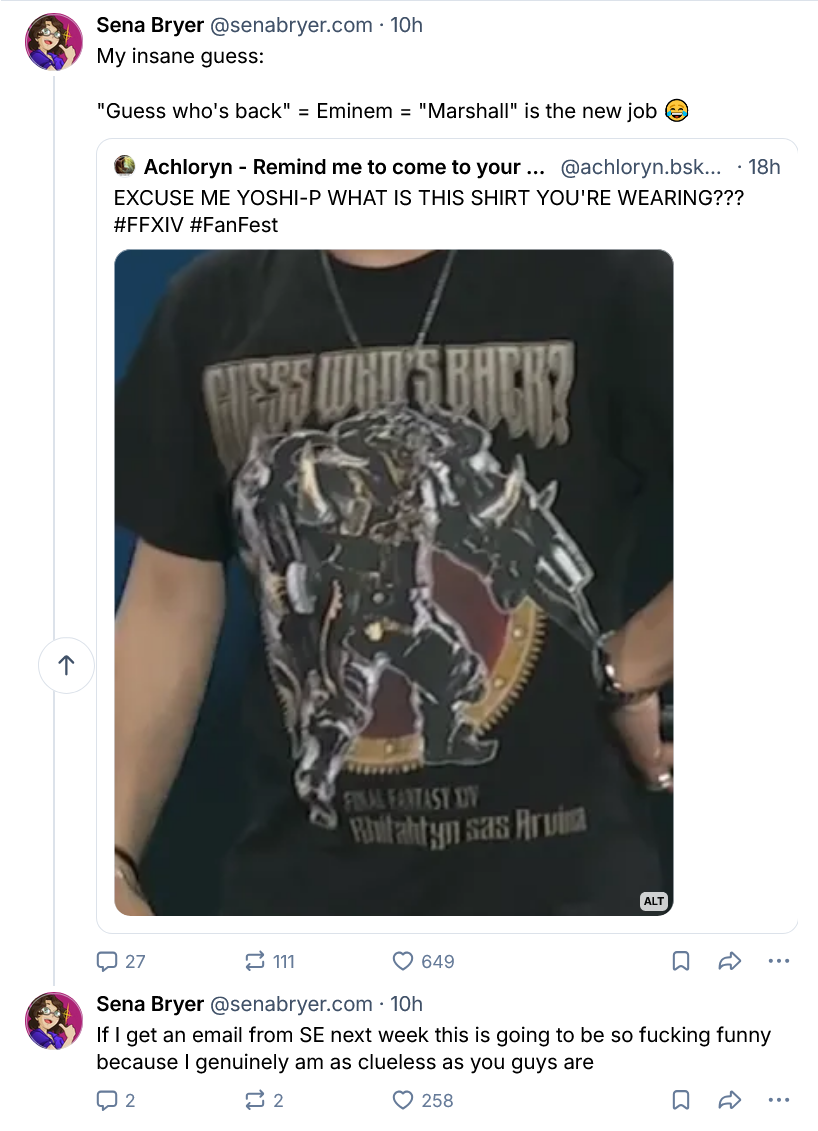 >>564731182Nta, but her not posting ANYTHING XIV related during the fanfest? You'd be delusional af if you think she still works for SE.