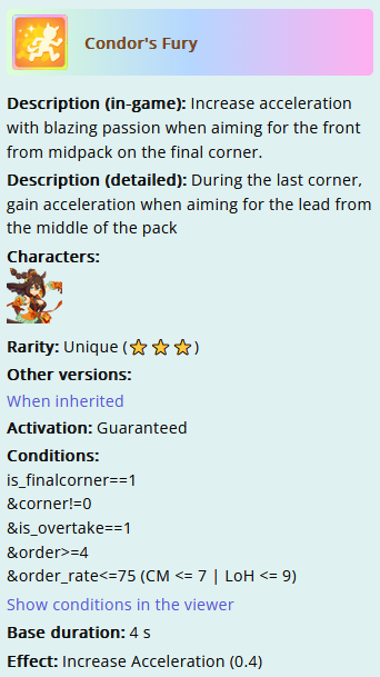 >>564726335Personally not a fan of triggering groundwork with TTL since it adds an extra layer of wit check but aside from that she looks good anon. Getting Barcarole on top of the other meta inherits is good (this is assuming she has decent spurt rate, but you can check that in the umalator)