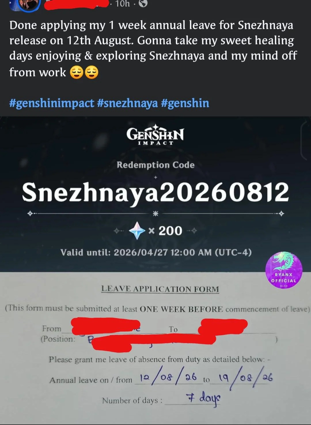 Previous: >>564714998>Behind the Scenes of Genshin Impact Redeemable CodeSnezhnaya20260812https://genshin.hoyoverse.com/gift?code=Snezhnaya20260812>Character Trailer - "Linnea: Precise Answers, Curious Wonders!"https://youtu.be/G3VvCIa-jB0 (EN)https://youtu.be/L86-DeBY2LM (JP)>Character Teaser — "Linnea: Companion on a Rainy Night"https://youtu.be/6YiuyqftA8U (EN)https://youtu.be/Ojd3Ln6_YEU (JP)>Version "Luna VI" "Augured Homecoming" Trailerhttps://youtu.be/mVWLSzkpGzA (EN)https://youtu.be/G6n5Zc3U0Ls (JP)>Current character banner: Linnea, Chasca, Illuga, Aino, Noelle>Current weapon banner: Golden Frostbound Oath (Bow), Astral Vulture's Crimson Plumage (Bow)https://hoyolab.com/article/44512635>Daily check-in rewards (permanent)https://webstatic-sea.mihoyo.com/ys/event/signin-sea/index.html?act_id=e202102251931481&lang=en-us>Redeemable Codes with Primogems (all regions): https://genshin.mihoyo.com/en/giftGENSHINGIFT8BHA0KFRG94KA0NBWRZZI3XJ (NEW)FairyGirlLinneaPSCA8NL4ZSPD>Useful Links (Wiki, Simulators, Maps, Character Builds, /gig/ friendlist, Third-Party Tools, etc.)https://rentry.org/giglinks/gig/ OP pastebin (use this if making new thread):https://pastebin.com/ca0zseQ9
