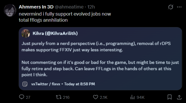 >xivg begs the developers to take risks on job design since the 2m meta is boring >Mr Prime puts his dick on the table and does the riskiest shit ever with evolved jobs >niggas have been bitching about it nonstop