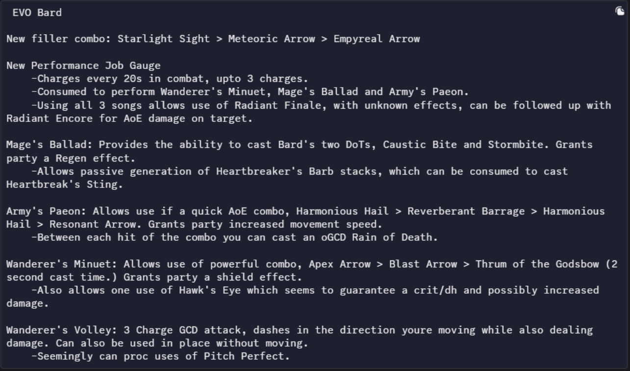 I'm really glad that BRD songs went from effects that affected your entire rotation to buttons you press to get 2 charges of a special skill you fire off before you go back to mashing 1 for another 20 secondsOld BRD was just too inaccessible