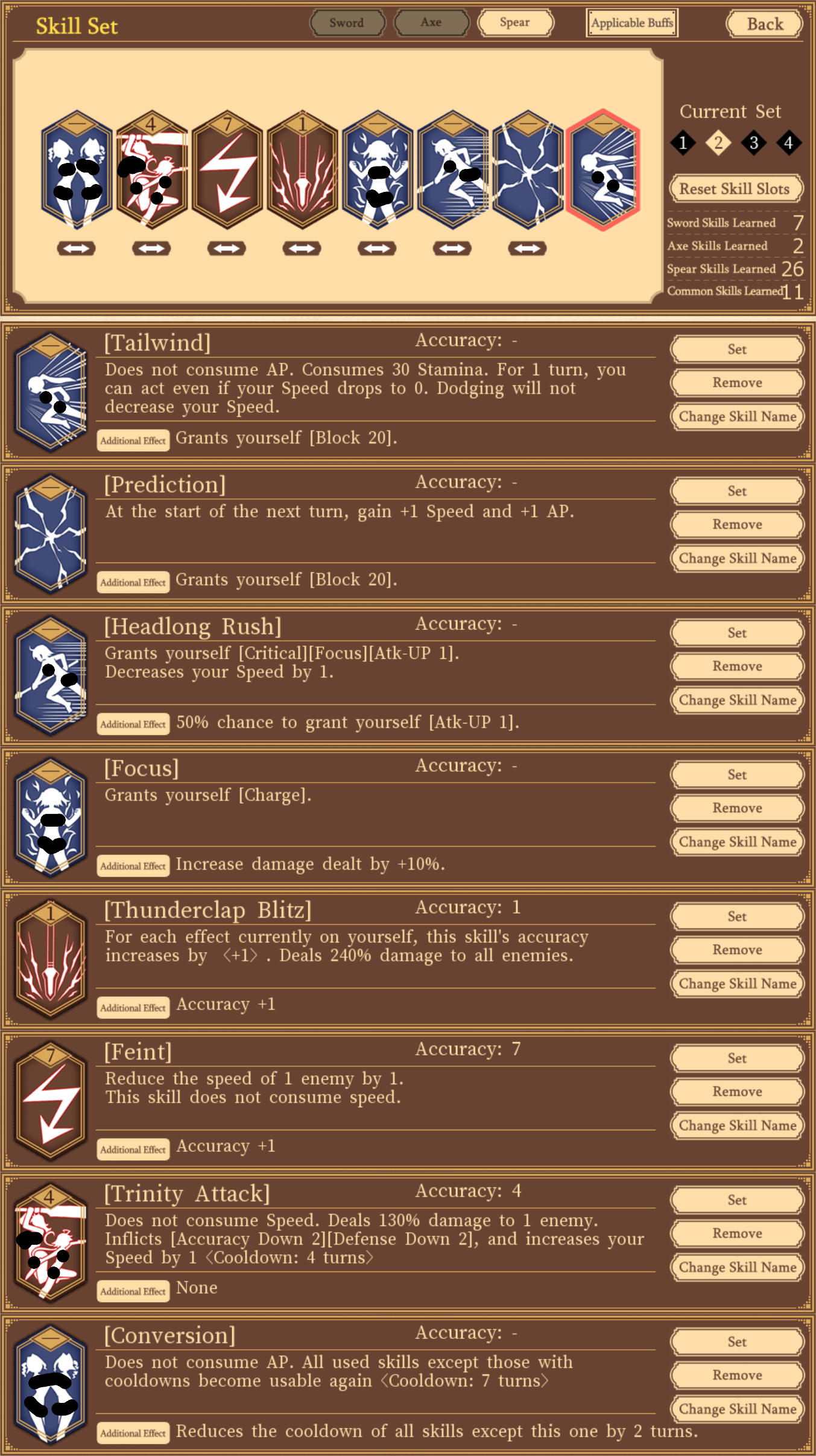 >>564754662slight spoilers for some unlockable skills.I did spear only and this is what I ended up with as my set up. Click all the buffs (tailwind is optional) and then thunderclap as a 6 accuracy nuke, or 7 accuracy with feint as an added skill. Feint also gets used for speed down on 6 speed enemies since trinity + focus + added thunderclap is 6 accuracy. Trinity is a very strong debuff and even gives you back speed, so sometimes you play it safe and skip thunderclap so you can keep max speed. With the accuracy down, tailwind buff, and the unlockable max 7 speed you can even dodge the final boss's giga 8 accuracy attack. Conversion never gets clicked and only exists to be an additional skill to cool down trinity faster. For weapon attributes I had stamina regen on buff skill use, increase crit damage, and limit break's flat damage bonus.