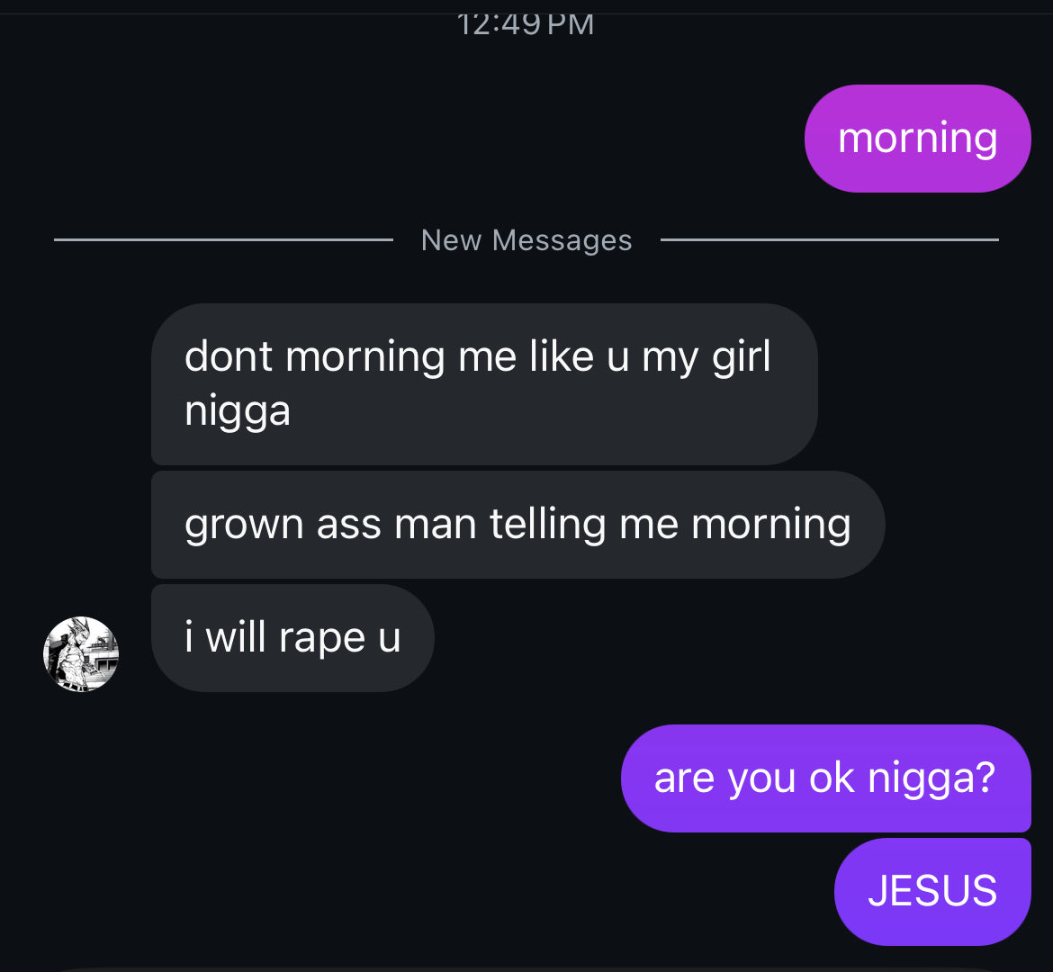 >>564796613I mean he ain't wrong though. If a friend sent me a good morning text I would rape them.