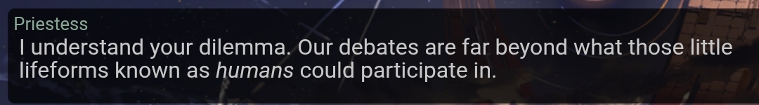 >>564820905You're misunderstanding. Priestess is just saying that what they're discussing is beyond what humanity is capable to understand. They ARE humans, this line is self-deprecating