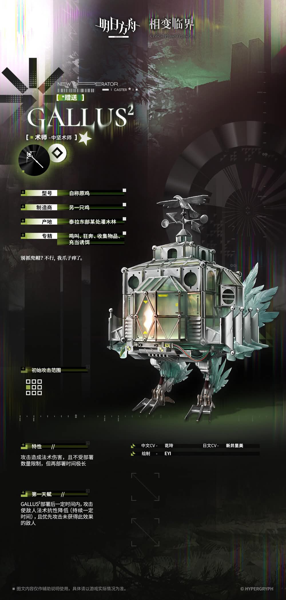 >After GALLUS is deployed, attacks reduce the enemy's spell resistance for a certain period of time, and prioritize attacking enemies who have not received this effect.Portable RES shred