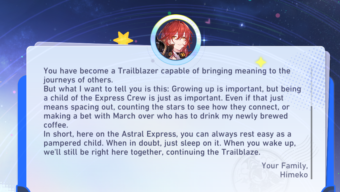 We need a year long prison arc where someone spills the beans about our Ex Stellaron Hunter background and we get frog marched to Pier Point Maximum Security in high tech cuffs that weaken Path Energy by the IPC while our stone heart "friends" stare at us in either disgust or amusement or a blank autist stare depending on who it is. Sugmalite does some spiel about how any good friend of Aventurine is an enemy of his and boasts that not even Acheron could break these prison walls as the gate closes on us.8 patches later and in a violent prison break we escape and finally reunite without our Express family as a hardened criminal and they agree to harbor us as we say goodbye to our prison gang members and the Express finally continue the Trailblaze except as fugitives.Huh? Save the game? Expand the lore? I just wanted a prison arc.