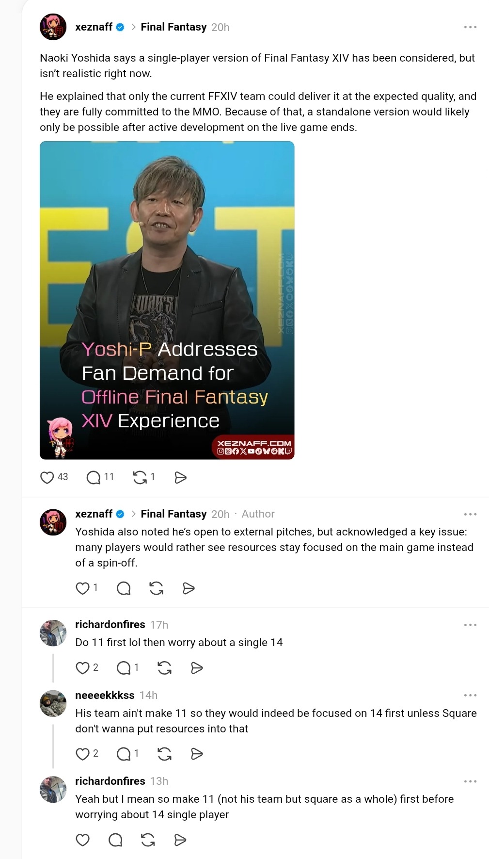 >>564873459Why is it a bad thing?11 and 14 have a good story. But are sadly trapped in a shitty grindy MMO with servers, patches, updates, a trans community, etc.I'd love to see 11 and 14 story without a gathering of trans miqotes at every city.