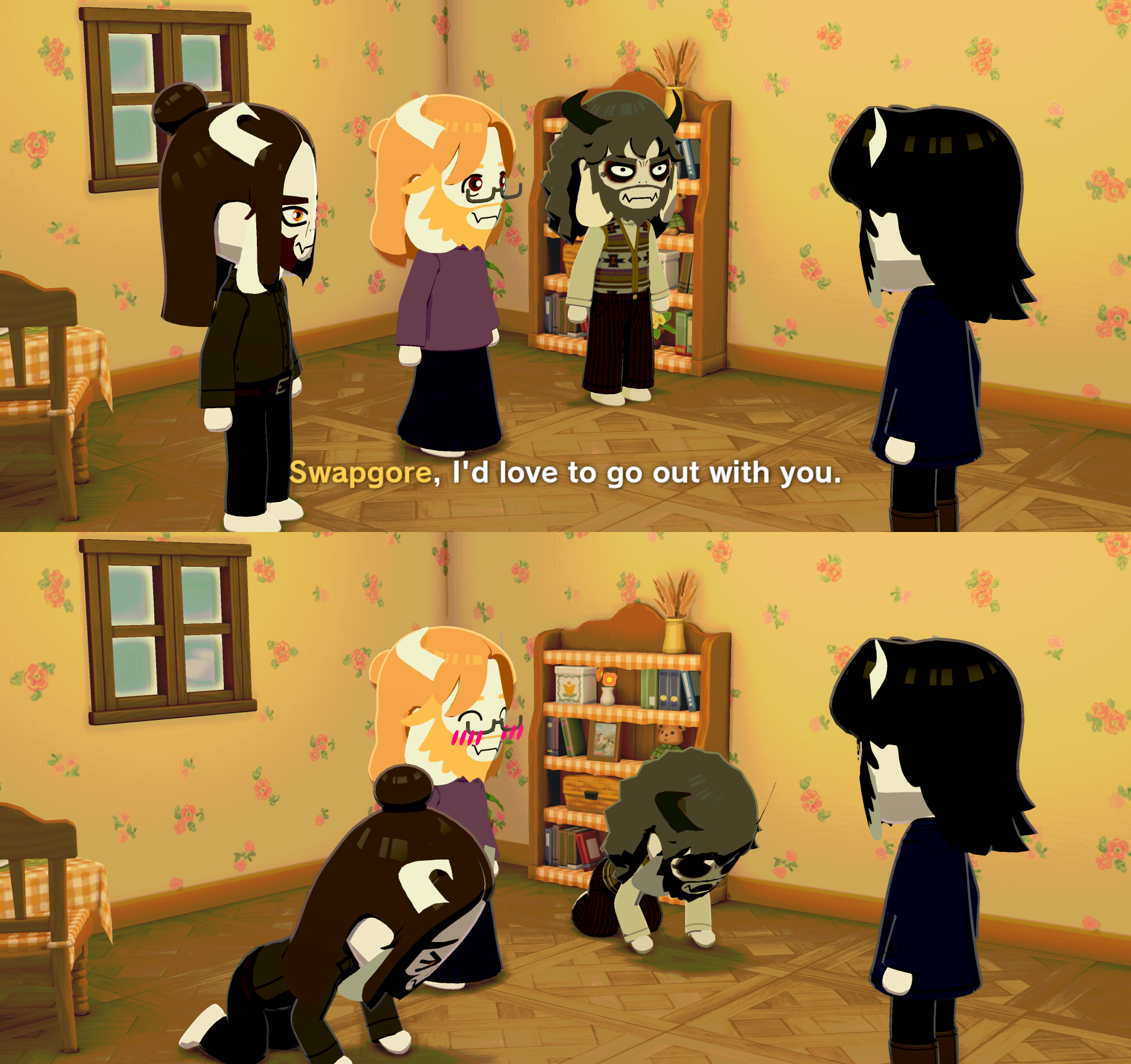 Dess pranking Kris by convincing Toriel humans only need to be fed once a week