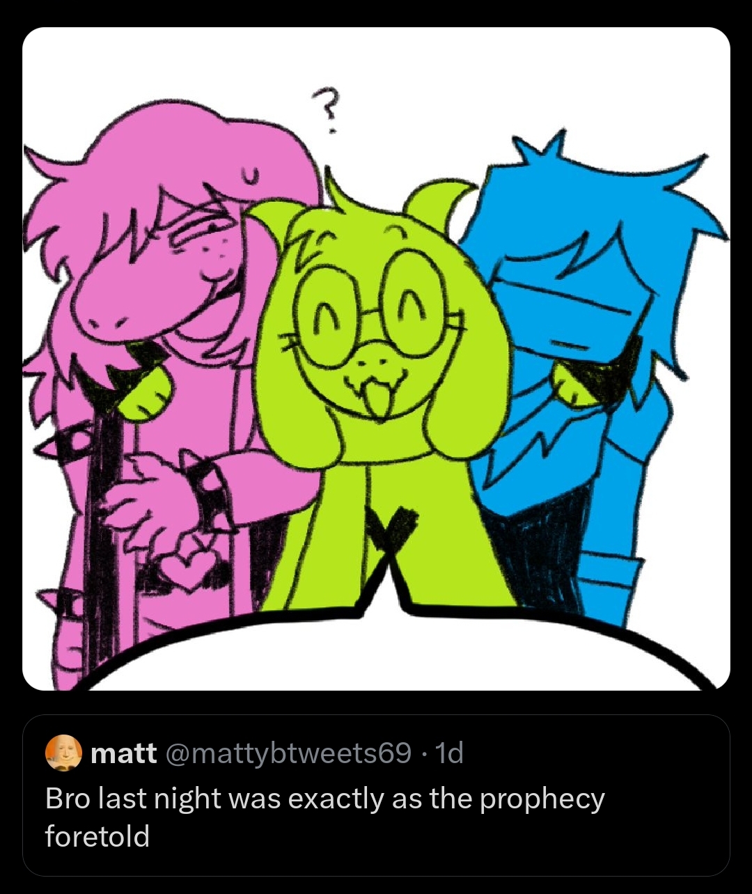 Double Throuple EditionPrevious good food and bad company: >>564858786 Spoilers ahead, proceed at your own Frisk.-DELTARUNE CHAPTER 1-4>https://store.steampowered.com/app/1671210/DELTARUNE/>https://deltarune.com-The Old Game>https://undertale.com-The Old Game's Demo>https://undertale.com/demo-The New Game's Progress>https://toby.fangamer.com/newsletters/>https://deltarune.com/#news>https://web.archive.org/web/20240815033908/http://www.twitlonger.com/show/n_1sqn3p9-Merch>https://www.fangamer.com/collections/undertale>https://www.fangamer.com/collections/deltarune-Books>https://pastebin.com/1MRmU0Gk (Undertale Artbook)>https://pastebin.com/hLxHi0a0 (Legends of Localization - Undertale)-Extra Content>https://undertaleqa.tumblr.com>https://undertale.com/alarmclock>https://deltarune.com/sweepstakes/-Text Dumps & Screenshots>https://pastebin.com/WG9u1fvH-Fanart Archives>https://pastebin.com/g2JqH6Ba>https://utg.vidya.pics/-Recommendbin>https://pastebin.com/fsqd5Sa6-Writebins>Current: https://docs.google.com/document/d/1ZaYVvltQ_Rmf-ggszf1bwmYDW2NUcfpTYU7JzfyMhVE>Old: https://writebin.surge.sh-Comicbin>https://pastebin.com/UJpBYSEE-Fangamebin>https://archive.is/iSiFg-/vg/ League team>https://implyingrigged.info/wiki//utg/-Wanna change the font?>https://rentry.org/utg-font-/utg/ Canvases>Current: https://r9.whiteboardfox.com/96009034-3168-5257>Previous: https://r2.whiteboardfox.com/25646067-7713-5501>Current: https://magma.com/d/3B5chWd0Vh>Previous: https://magma.com/d/QiFH9rWyRh-Pippins Wiki>https://utg-pippins-ocs.neocities.org-Thread Template (paste the current whiteboard links)>https://pastebin.com/rTN8SxAw