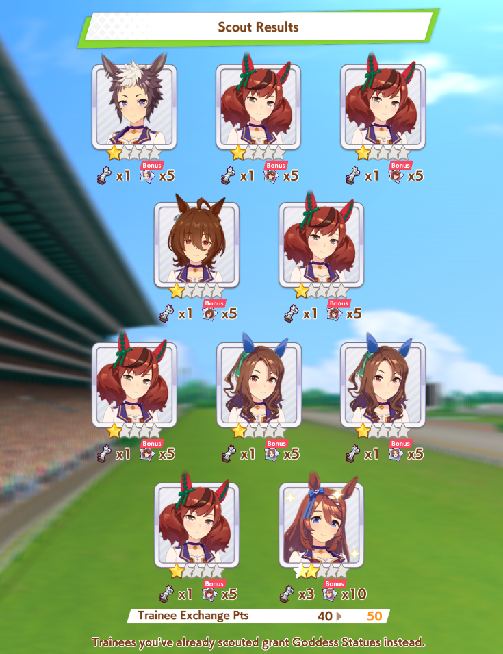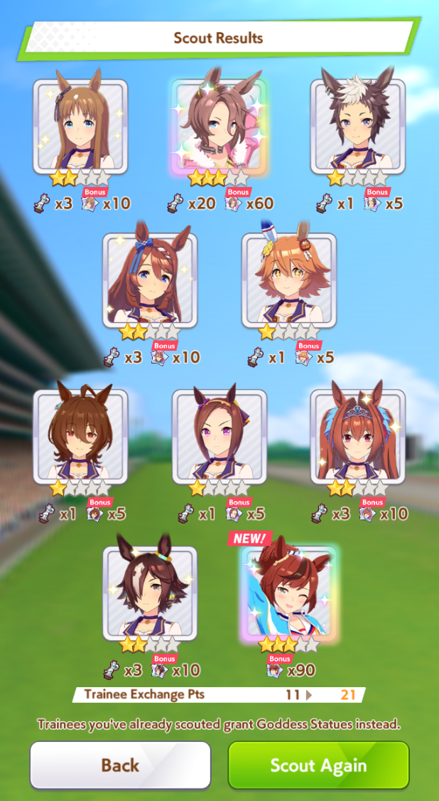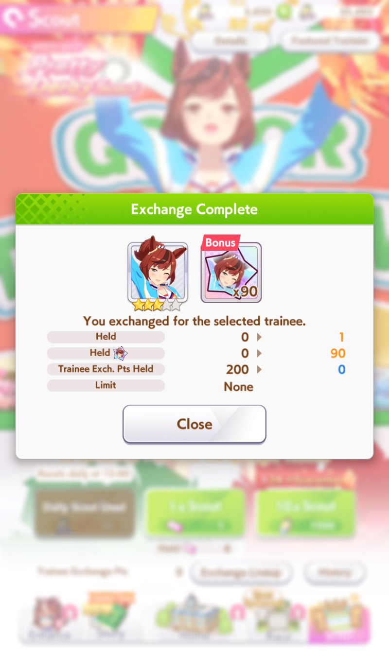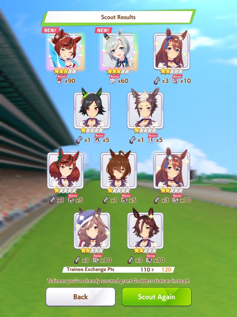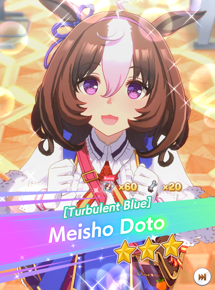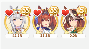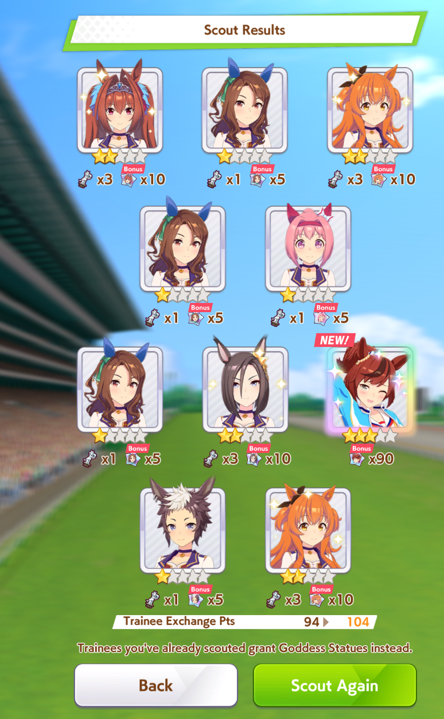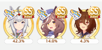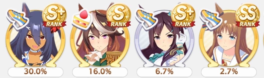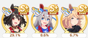 Current Rate Up: Admire Groove (3*), (SSR) Tokai Teio, Almond Eye, Eishin Flash, Dream Journey, Calstone Light O, Curren Bouquetd'or, Mihono Bourbon, Tamamo Cross, Stay Gold, Daiichi Ruby