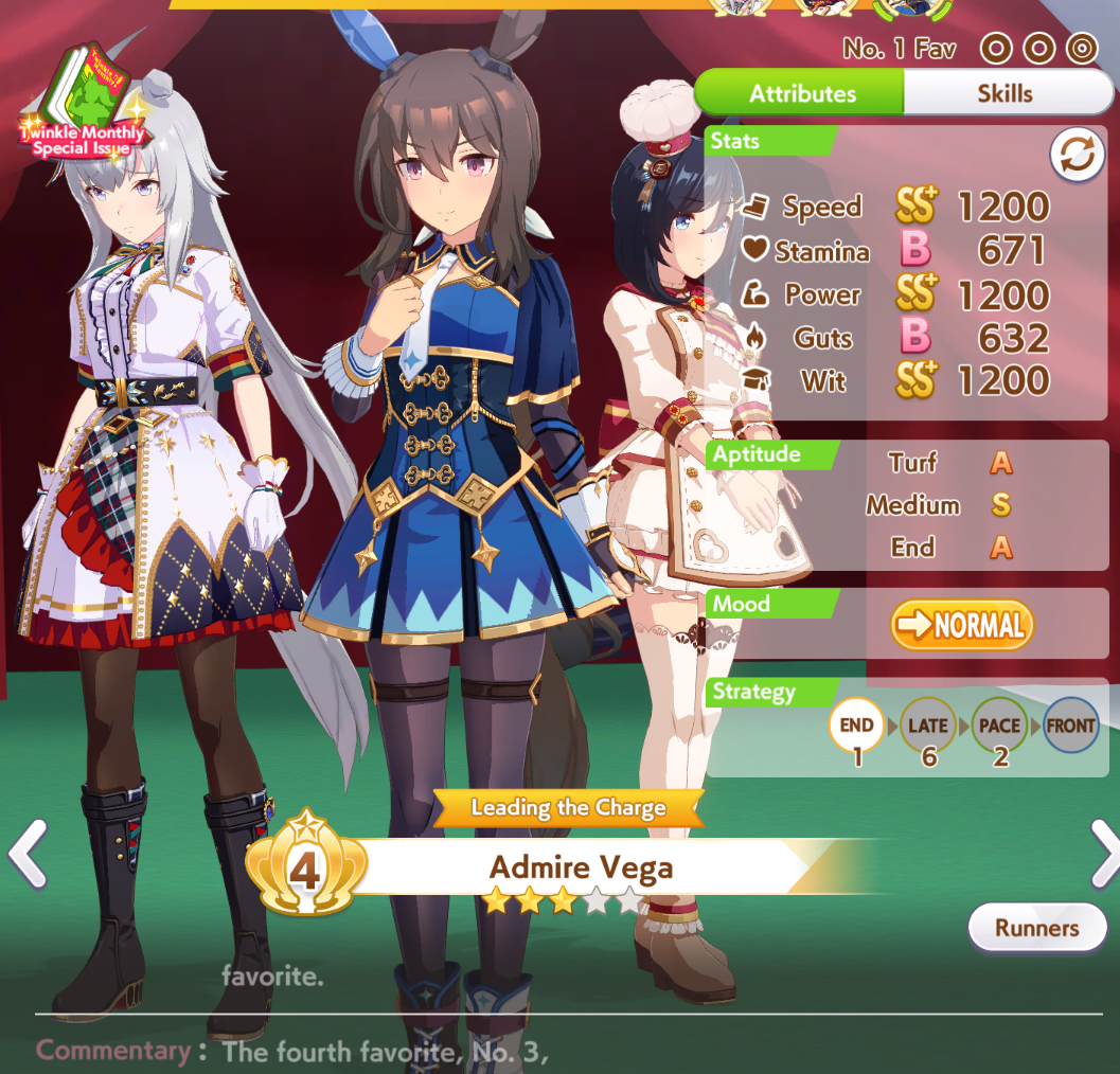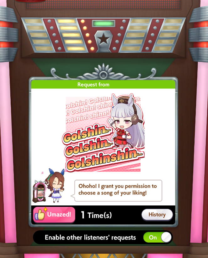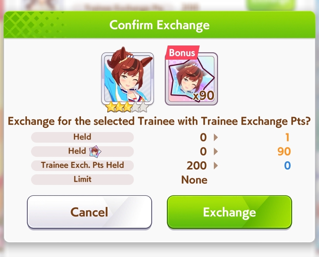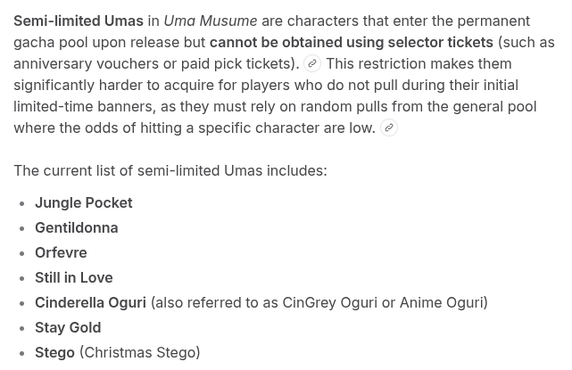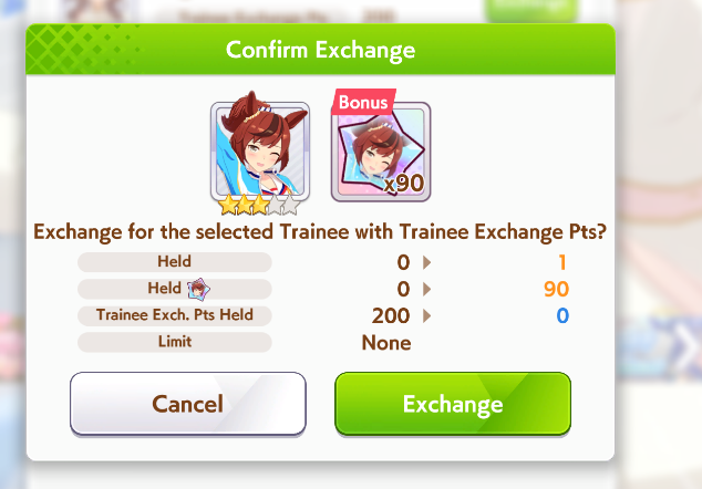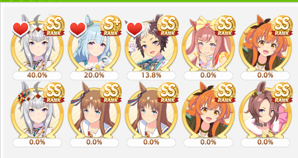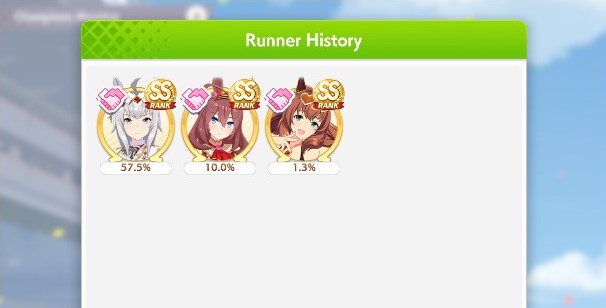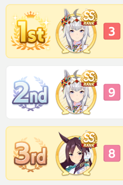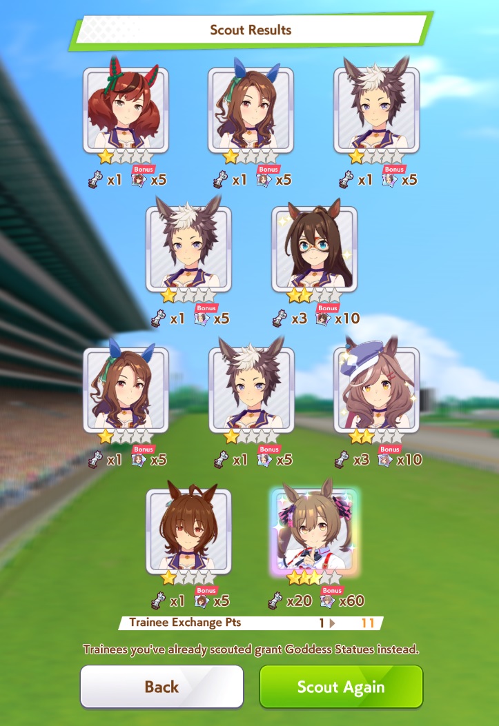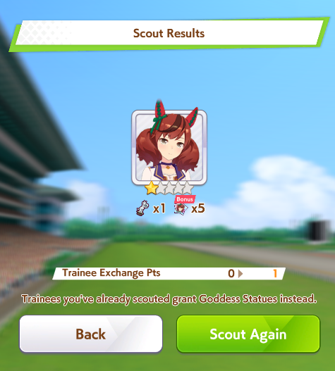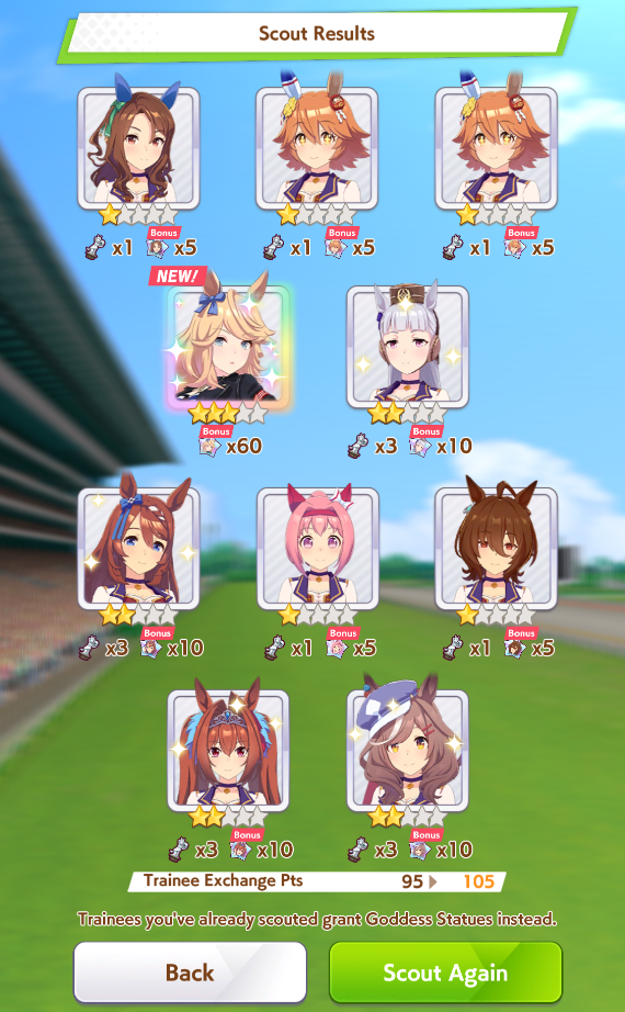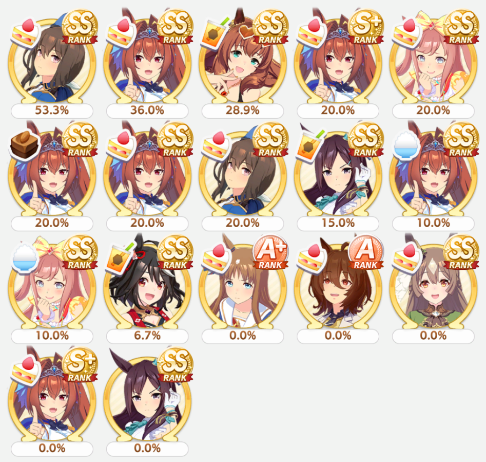 Current Rate Up: Admire Groove (3*), (SSR) Tokai Teio, Almond Eye, Eishin Flash, Dream Journey, Calstone Light O, Curren Bouquetd'or, Mihono Bourbon, Tamamo Cross, Stay Gold, Daiichi Ruby