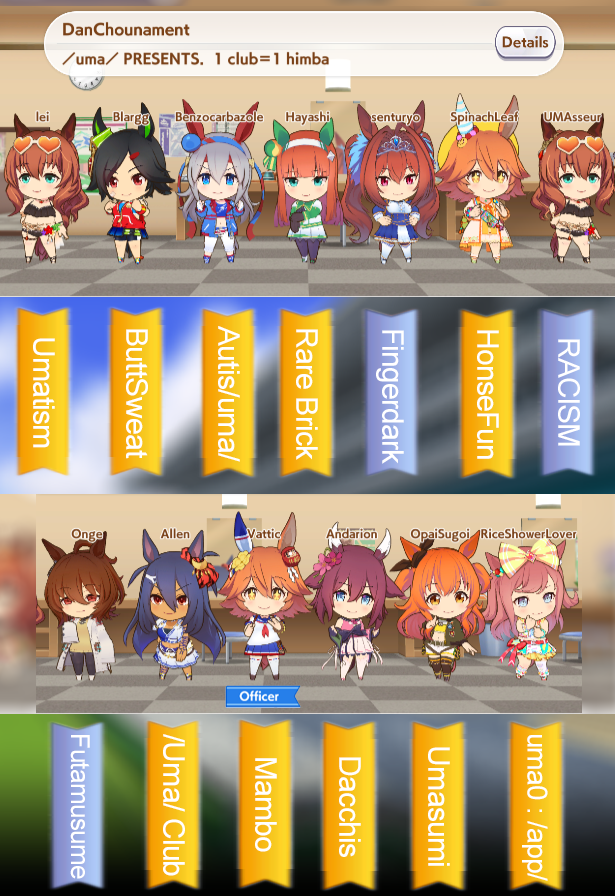 THE /uma/ tournament has started13 trainers have sent their best but only ONE will come out on topWill the TRUE /uma/ clubs win or will the ephemeral gold trophy go towards the outsiders?Find out as soon as my post cooldown expires!Fortunately no gay shit happened.I haven't checked if anyone is the dancho I'm already late by like 1/2 hour