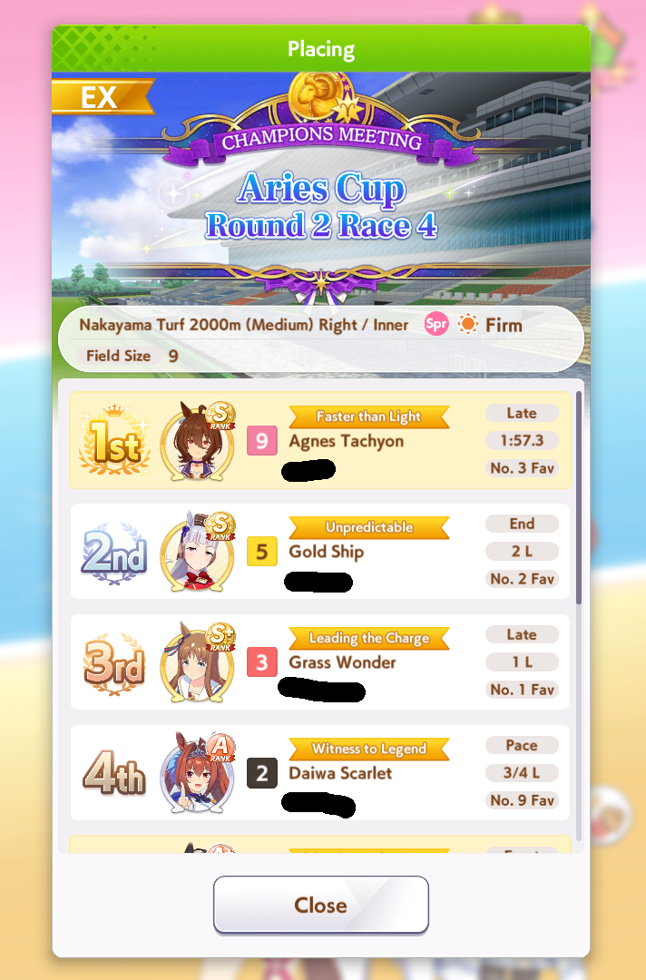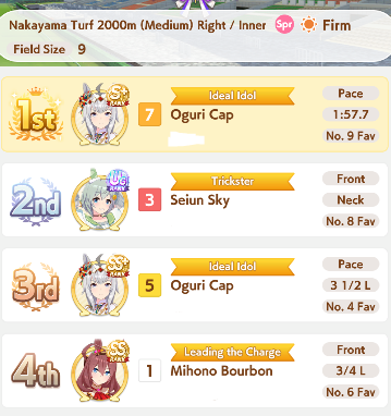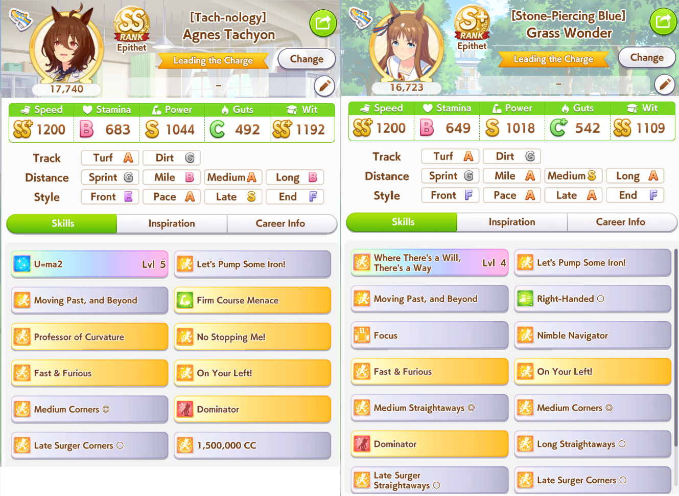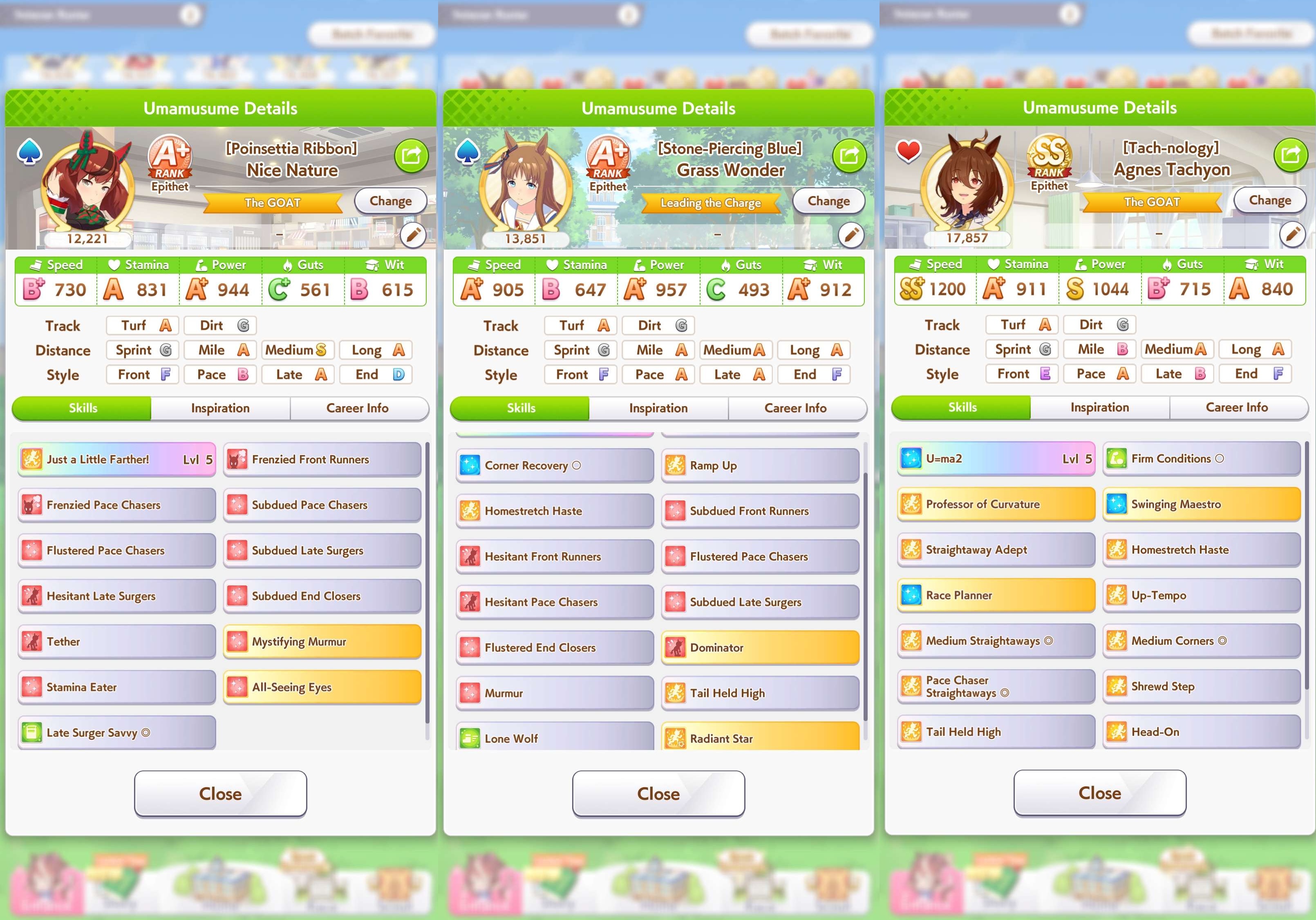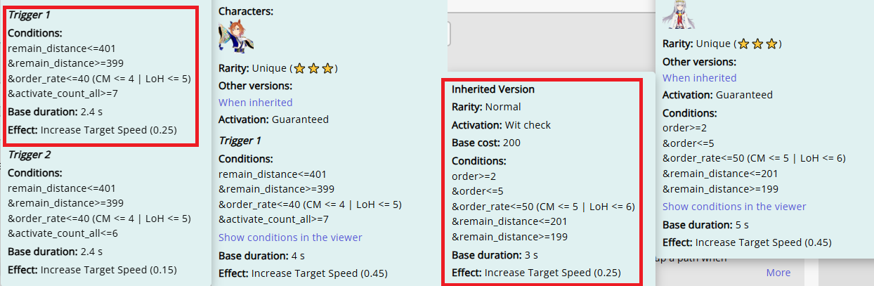 >>564934421There were some races they would hit all, but normally at least one would miss. Straightaway Spurt and NSM were the heavy lifters, MPB was also very strong. PI was the least reliable, but provided another redundancy and still works after a rush. Now that NSM isn't free anymore I think MPB and PI are mandatory for both late and end; you need a fast acceleration for your speed multiplier to close that gap.