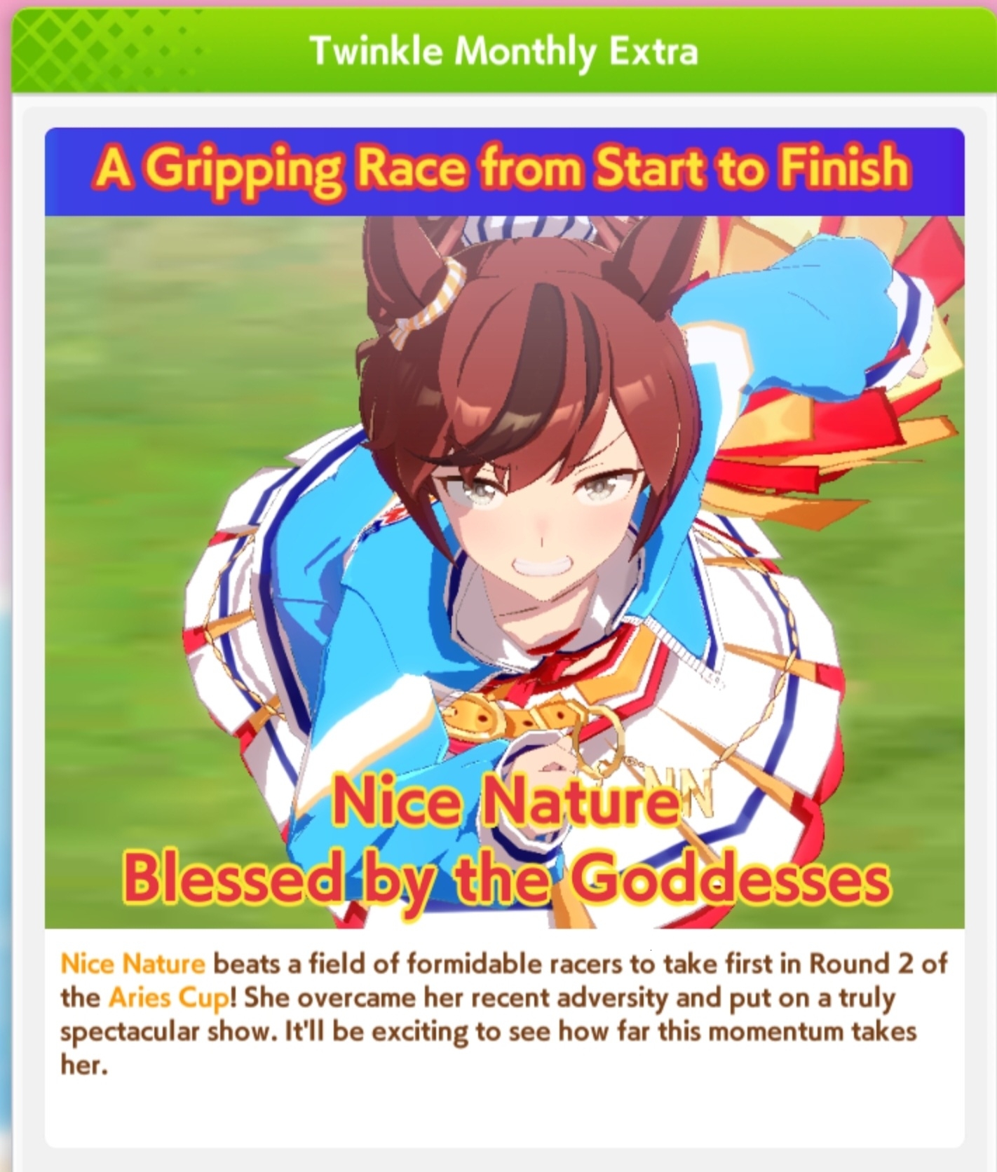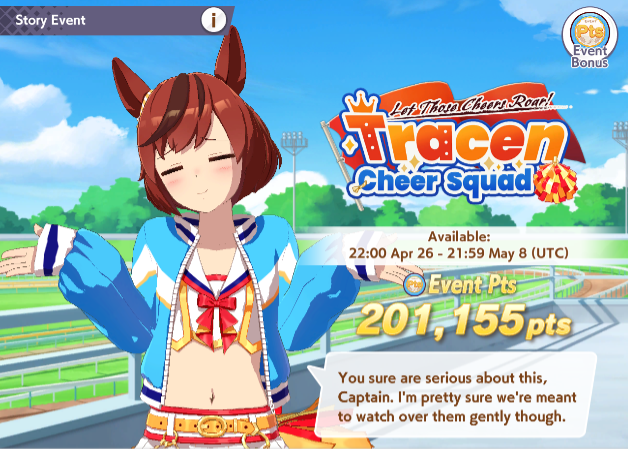 Previous: >>564909389>Global Game NewsLink your account to Cygames iDCurrent Scenario: Make A New Track aka "Trackblazer"Current Rate Up: Yaeno Muteki (3*), Cheerleader Nice Nature (3*), Cheerleader King Halo (3*), SSR Twin Turbo (Speed), SSR Ines Fujin (Guts), SSR Bamboo Memory (Guts), SSR Seeking the Pearl (Speed)Current CM: Aries Cup - Nakayama Turf 2000m Medium/Right/Spring/FirmCurrent Event: Tracen Cheer Squad>Schedule04/26 - Golshi Week Celebration04/26 - Cheerleader Nice Nature (3*), Cheerleader King Halo (3*), Bamboo Memory (SSR), Seeking the Pearl (SSR)04/26 - Tracen Cheer Squad Story Event04/30 - Ines Fujin (3*), MR. C.B. (SSR), Tokai Teio (SR)https://pages.snep.pw/uma/anni-skill-changes>JP Game NewsCurrent Rate Up: Admire Groove (3*), (SSR) Tokai Teio, Almond Eye, Eishin Flash, Dream Journey, Calstone Light O, Curren Bouquetd'or, Mihono Bourbon, Tamamo Cross, Stay Gold, Daiichi RubyNew Scenario "Beyond Dreams" releasedTimeline: https://uma.moe/timelineCygames Webstore: https://webstore.cygames.com/en/umamusume_en>Thread Clubshttps://rentry.co/umaglobalclublistYou must be E3 (20k points) to join a circle. Apply with /uma/ or /vg/ in your profile or post ID in the thread.>All Guides & Resourceshttps://rentry.org/uma26Game databasehttps://gametora.com/umamusume (Click the gear to switch between JP / global server info)A basic guide for newfagshttps://rentry.org/umaglobalFind networks if your region is blocked from the game or clienthttps://www.umavpn.topSeiyuu & Concertshttps://rentry.org/umstUmamusume Birthday Calendarhttps://ウマ娘.攻略.tools/events/birthdayUma Texthttps://umareader.idsmile.xyzCustom Stickershttps://schizo.farm/resources/stickers
