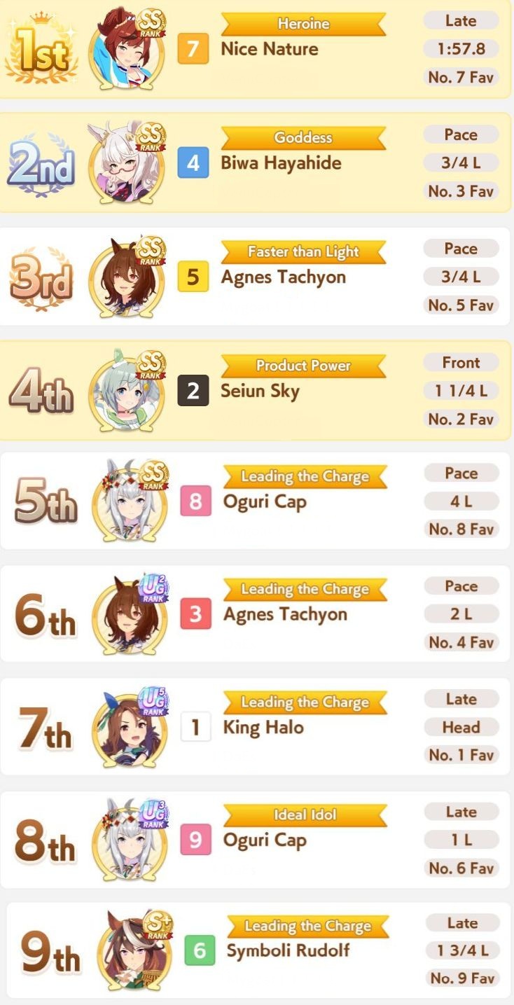 I have several questions. 6-7 threads ago I read that as Late/End you need only 2 accels. The point of getting a lot of them is to softguarantee that some of them procs. Is it true? So there is a cap (as in peak) of acceleration that you can achieve? Am I missing something? And what kind of deck do I use for new Nature? I usually use Kitasan, borrowed NTR, Tachyon, Sunday and Nishino power. I have MLB FM but since she can't provide anything good for her, I may as well take someone else. Have a nice Monday everyone.