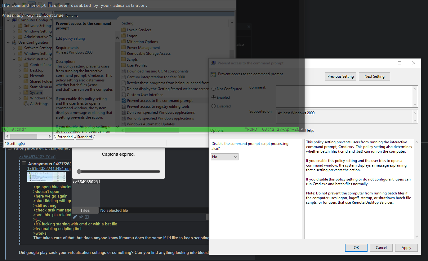 >start configuring system>remember to log in>go open bluestacks>doesn't open>here we go again>start fiddling with group policies>still nothing>check task manager>see this: pic related>[...]>it's fucking starting with cmd or with a bat file>try enabling scripting first>worksThat takes care of that, but does anyone know if mumu does the same if I'd like to keep scripting disabled?