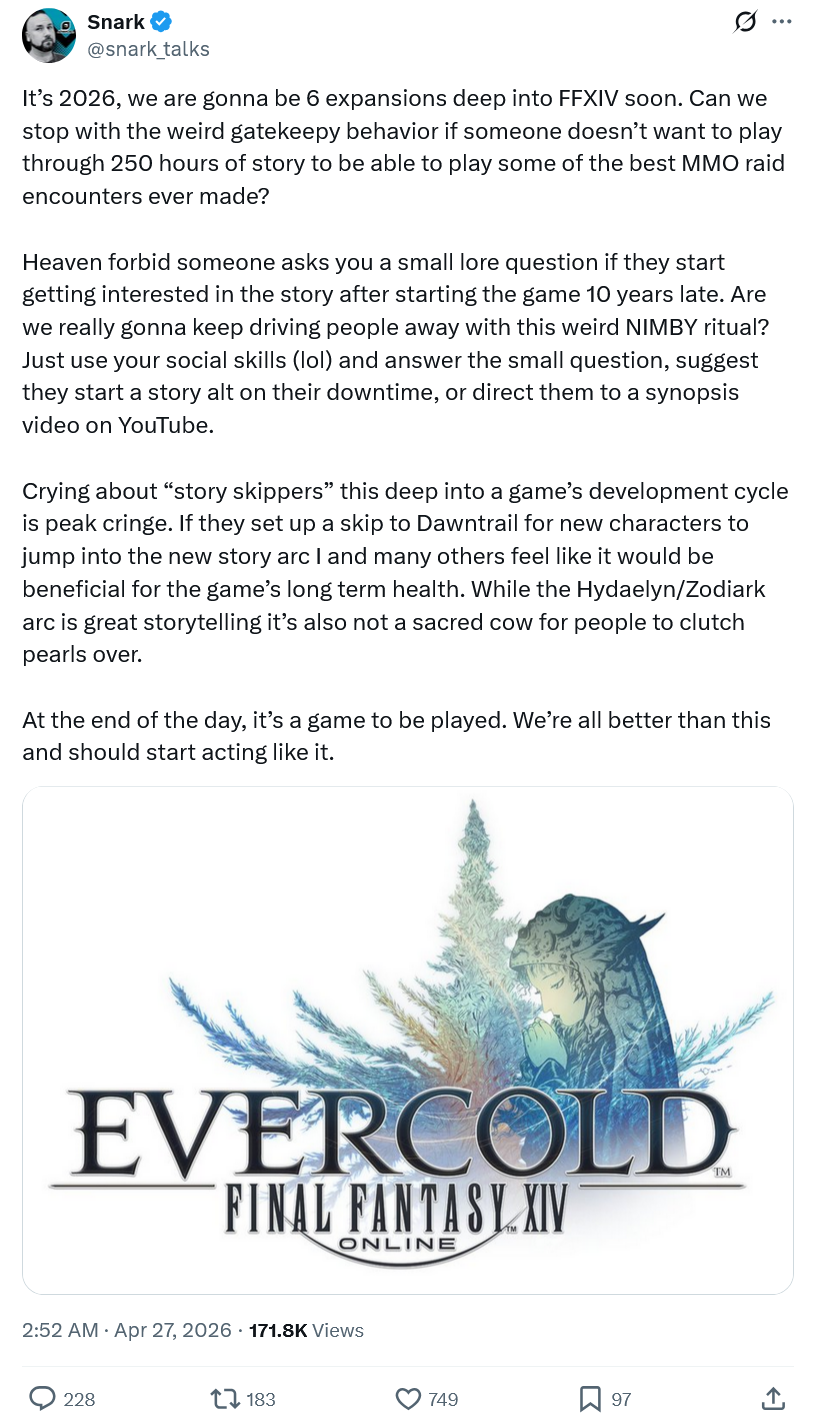 Just wanna ask how you plan that kind of story to go when the Warrior of Light is the currently the de facto political elite. They're basically a walking deity propped up by the Scions who have had a hand in shaping every major power, and everyone genuflects in your presence automatically when they see you. I mean did you see them linkpearl for "help" and move ships full of highly desirable magic crystal over with 0 pushback? I don't think you come back from that