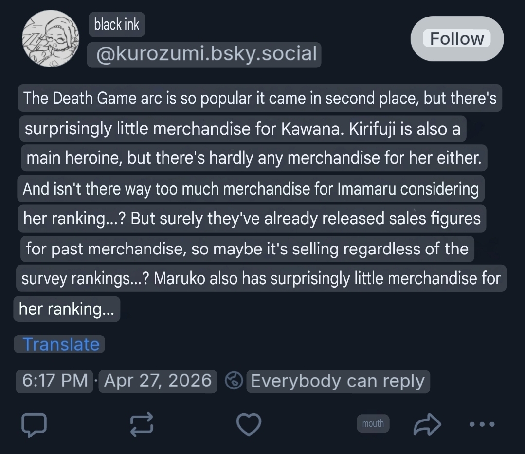 >>565075580>Chiaki>Kaede>Kyoko>>565075654of course a character drops in popularity when the company making the merch refuses to give her anythingHiruko was on the same bench until recently (her last collab was the maid one)