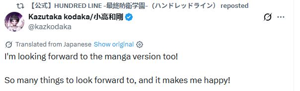 Manga waiting room.A general for the discussion of TooKyo Games' "The Hundred Line -Last Defense Academy-" Tactical RPG and adventure game written by Kazutaka Kodaka and Kotaro Uchikoshi.Previous thread:>>564826105 Buy the game and play:>Steamhttps://store.steampowered.com/app/3014080/The_Hundred_Line_Last_Defense_Academy/>Switchhttps://www.nintendo.com/us/store/products/the-hundred-line-last-defense-academy-switch/Game information:>Official websitehttps://hundred-line.com/en/>Flowchart/Route guide (No Spoilers)https://arch-img.b4k.dev/vg/1746873993910.png>Flowchart/Route guide (Spoilers)https://arch-img.b4k.dev/vg/1747005823544.pngGame resources:>Former Lives of the SDU: File 03 – Hiruko Shizuhara’s First Battle (Novel)https://docs.google.com/document/u/0/d/1wAGYS0WiNCIPvbXfFF0UyhGgDP4LK7aMhbupLBOoHok>Character sprites, CGs, Cut-ins, and other assetshttps://drive.google.com/drive/folders/1vc56NSu3o-WGDAaFGVVk9n7cHmvD32J->Artbook (Character design sheets)https://drive.google.com/drive/folders/1xFZvHYyabQUCRw-myEcYwRKIF4qfcD_T>Complete Soundtrack Albumhttps://mega.nz/file/uAo0FQrC#yA1IxguTxIWvGEM0-E3GrJ4Csqm6KLLI70n2fBirrKALatest:>Interview with Kazutaka Kodaka, Tomoyo Kurosawa and Taihi Kimura (Spoilers for the 2nd scenario)https://news.denfaminicogamer.jp/interview/250508n>Kodaka's Interview with Bloomberghttps://www.bloomberg.com/news/newsletters/2025-07-11/-the-hundred-line-last-defense-academy-nearly-bankrupted-too-kyo-games>Kodaka is currently making the Darumi prequel novel>Eito's novel will be available soon>Dengeki Online Popularity Poll results:https://dengekionline.com/article/202510/51018>Kodaka's interview with DekuDealshttps://www.dekudeals.com/articles/kazutaka-kodaka-hundred-line-last-defense-academy-interview>Kodaka and Koizumi interview with Weeby Newzhttps://www.youtube.com/watch?v=Gdkp9qZ_wWs>1st anniversay event held on April 26thhttps://hundred-line.com/event/