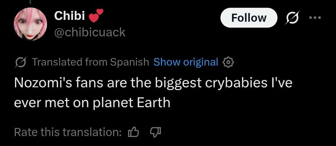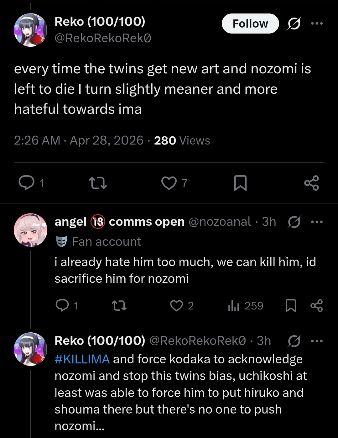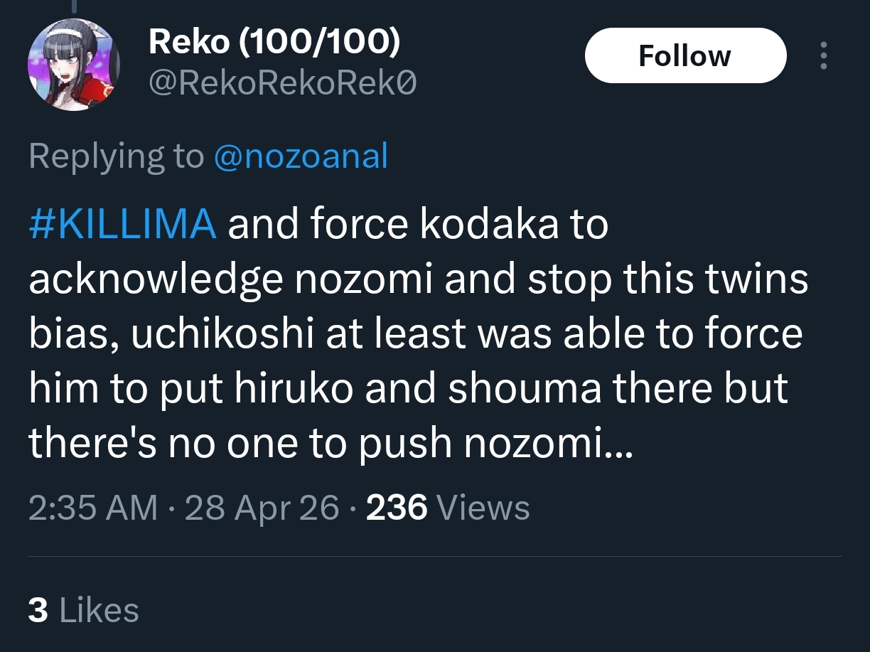 >>565083217>Replying to @nozoanalMental illness for such posters to post "uwu it's so problematic how everyone hates Nozomi for being a strong woman"