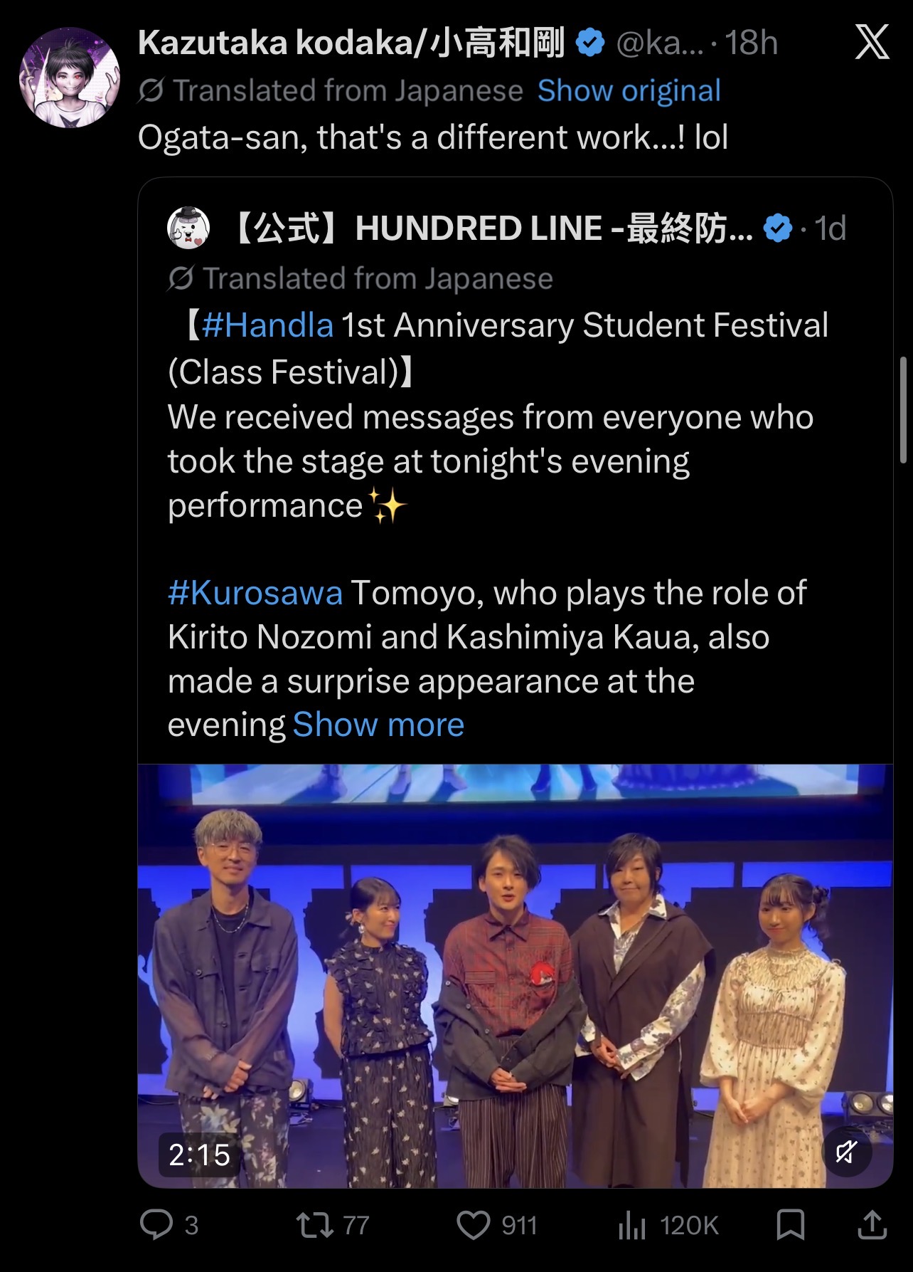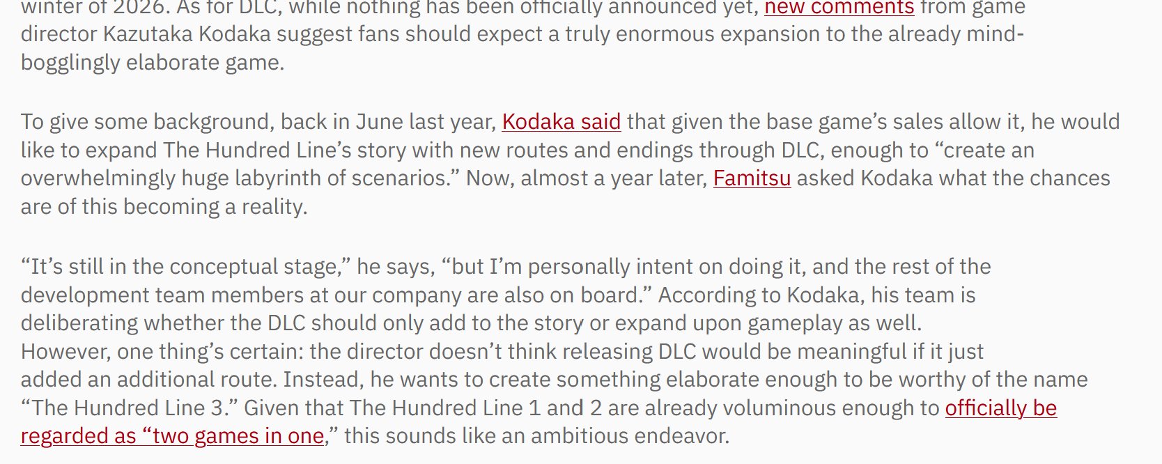 >The game was ranked 7th in Rolling Stone magazine's "Best Games of 2025" and won the Japan Game Awards Excellence Award, among other accolades. What are your thoughts on being recognized by users and the media alike?>Kodaka: I played almost all the games that were talked about last year. And objectively speaking, I think 'Hundred Line' is definitely in the top 5 games released in 2025. I wonder if it'sfair for me to compare it to other games, but in my opinion, it's one of the top 5 titles. In that sense, I think the people who gave 'Hundred Line' the award must haveactually played the game properly(laughs).>Kodaka: Conversely, I wonder if the awards that didn't choose 'Hundred Line' don't actually play the game (laughs). It made me realize, "Ah, these awards don't seem to play the game.">Rolling Stone is an American media outlet, isn't it? Even though it's localized, I think it's significant that a text adventure game originally in Japanese is being appreciated in America.>Kodaka: This isn't just about 'Hundred Line,' but Japanese games often don't resonate well in the West. In particular, the games we make tend to have more anime and manga-like expressions, and hardcore gamers sometimes say, "Well, that's a bit much..." and avoid them. In some cases, the work isn't even nominated for an award. So, it's really gratifying to have people like this who properly recognize and appreciate it.>Kodaka: I'm sure all of you Denfaminico Gamer readers who are reading this article have played "Hundred Line," right? Since you're reading Denfaminico, you all must be game lovers, right? If you haven't played it, you can't call yourself a gamer (lol). Otherwise, you'll be just like those overseas critics who say, "It's anime-like, it's manga-like, so it's not a game" (lol).https://news.denfaminicogamer.jp/interview/260427h