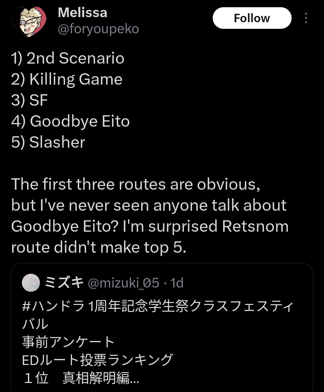 >>564956708Good, polycule was a shit and it's only one of the worst things in Killing Game route.>>564958008This girl is the exception. Her fanart is wholesome.