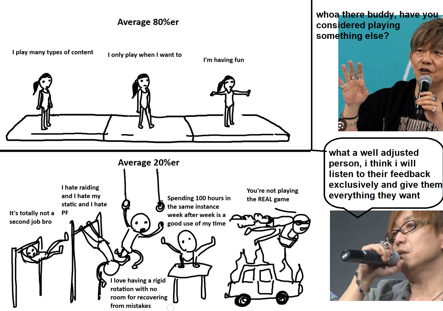 >>564966034/xivg/ is of the opinion that “we play content, but we only did it when it first came out and that counts”. Instead they obsess over Transformers by Michael Bay and holding auction for all the classics on the ‘cord. That’s the real FFXIV and we all like that.