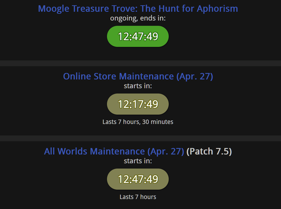 >Upcoming Expansion: Evercoldhttps://na.finalfantasyxiv.com/evercold/>Moogle Treasure Trove - (March 31st -> April 28)https://na.finalfantasyxiv.com/lodestone/special/mogmog-collection/202603/lba1j4i815>Patch 7.5 Notes (Preliminary)https://na.finalfantasyxiv.com/lodestone/topics/detail/33c47e6b7aa6fe0750ebb167841e35bea26ceb7e>Patch 7.5 (April 28th) Preview Sitehttps://na.finalfantasyxiv.com/dawntrail/patch_7_5/>Resourceshttps://rentry.org/xivgresources>Meetups• April 29, 9:00 PM EDT | Primal, Famfrit, Lavender Beds W15 P20 | Spooky Club: Future Diary (Mirai Nikki)• May 1, 7:00 PM EDT | Goblin, North Shroud (21.8, 26.6) | Elezen Meetup >>564559747 • May 3, 10:00 PM CEST | Twintania, Goblet, W13 P30 | F1 Miami GP Live Party >>564845270 Previous: >>564943781