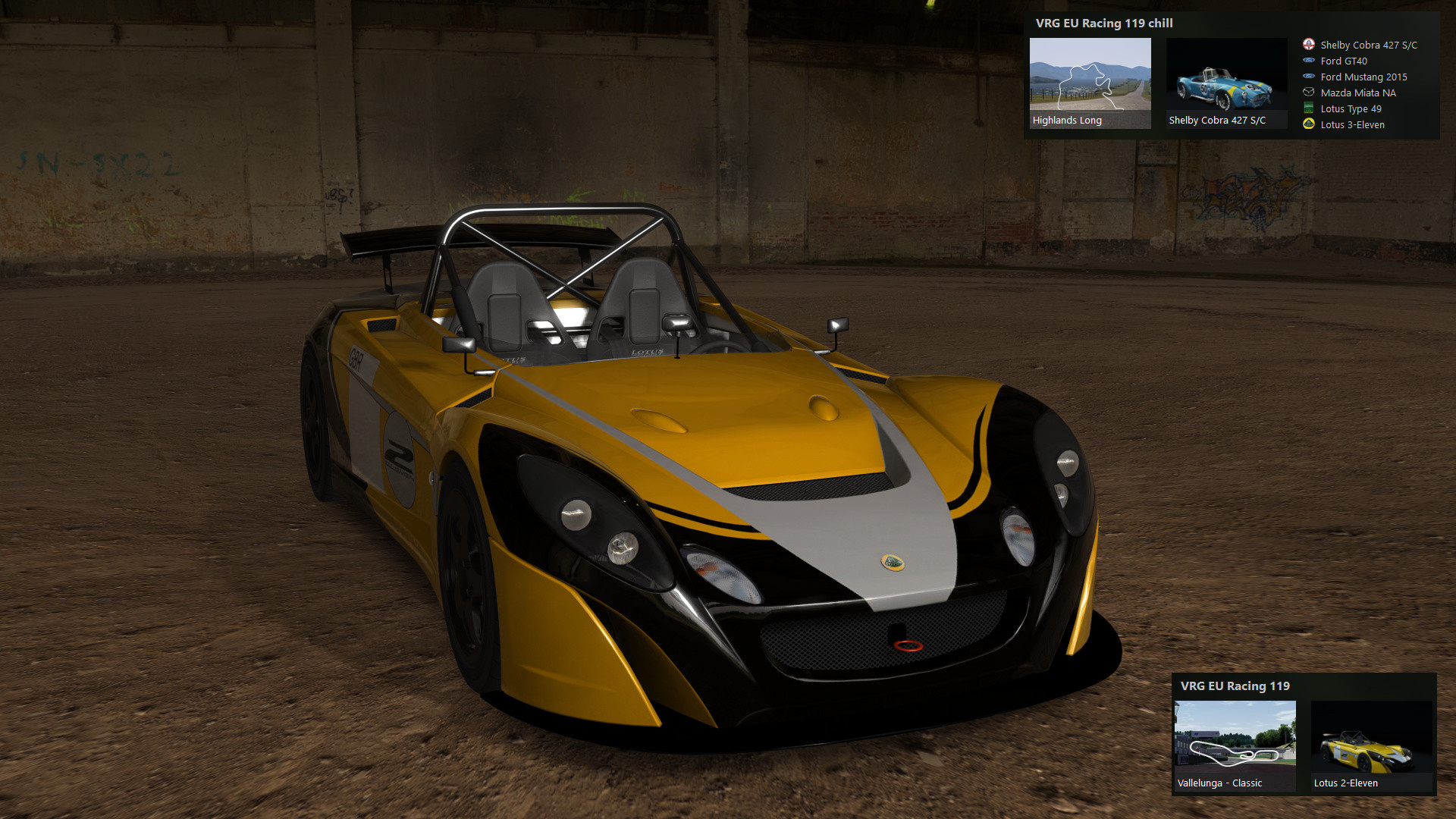 EU Assetto Corsa: European Racing clubRace 11918:00 UTC 20:00 CET, 4th of MayTime to get a bit faster! Lotus 3-Eleven in Vallelunga!60 minute practice12 minutes qualifiers14 laps raceAssetto Corsa Content Manager - a better launcher and mod manager: https://assettocorsa.club/content-manager.html To install mods: just drag and drop zip files from mega onto the Content Manager windows and click on the hamburger menu on top right. Install stable custom shader patch and 7-zip plugin in Content manager.For communication we'll use mumble at voice.vrg.party port 64738, as it doesn't need any registrations or logins.https://www.mumble.info/MODS: NO MODS!