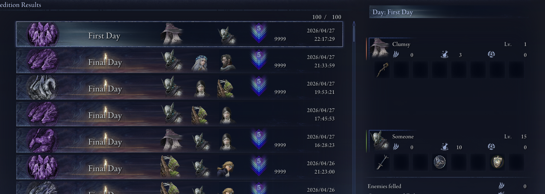 >5 games yesterday with randos>went from D4 4200 to 3300>day 1 loss to dreglord deathknights>day 3 loss to dreglord nearly beat him but everyone had run out of flasks so couldn't get the last 1/10th of his health>day 3 loss to ED fulgor, it was going well then the rest of my team 2bar'd and I got hit wating for my ult to charge so I could res them>day 3 loss to ED adel, ended up going down trying to res someone>day 2 loss to tree sentinel, was level 14 giants flame build for caligo but someone had fucking garbage rng and didn't find any good spells or passives to switch from O flameMaybe today will be better...