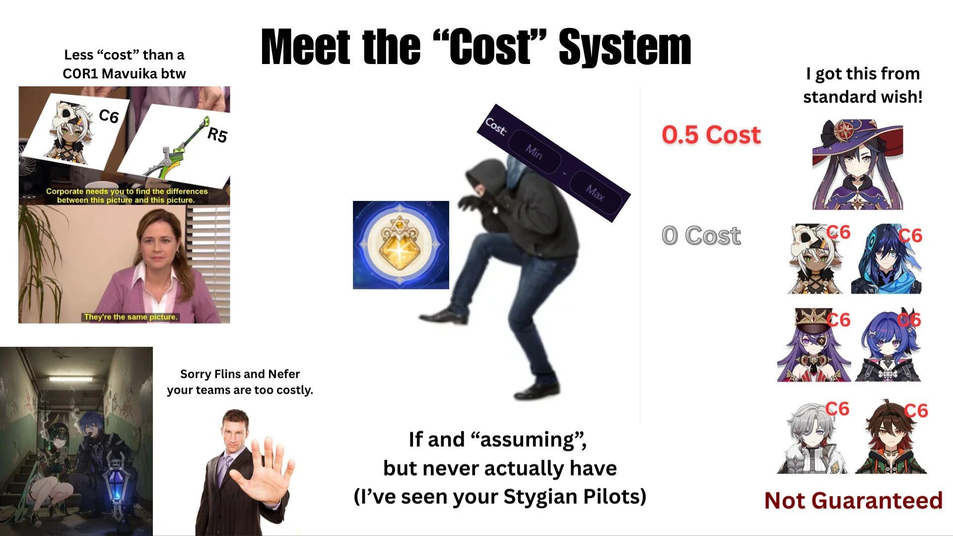 the odds on betting on future impact characters is the probability of them releasing what's needed for the character to be goodthe more unlikely things the character needs, the more likely it will be a brick forevernicole needs a good main dps that is hexen, deals pyro dng and whose team also does decent damage from atk scaler sub dpsthe first one alone is already a pretty big condition considering that, beside the new stellar meme, they'll likely move on to shilling a new bait archetype for liyue characters the next region and forget hexen ever existed