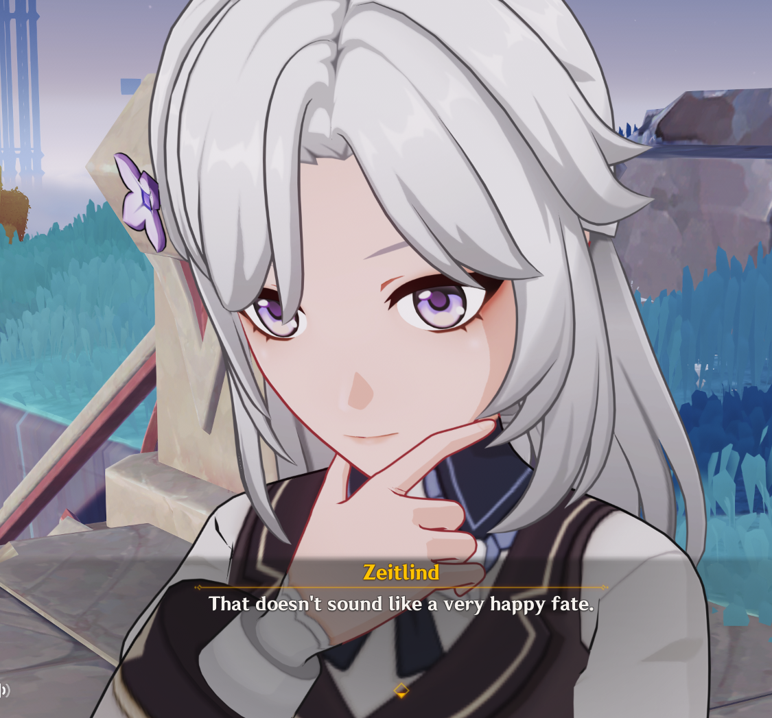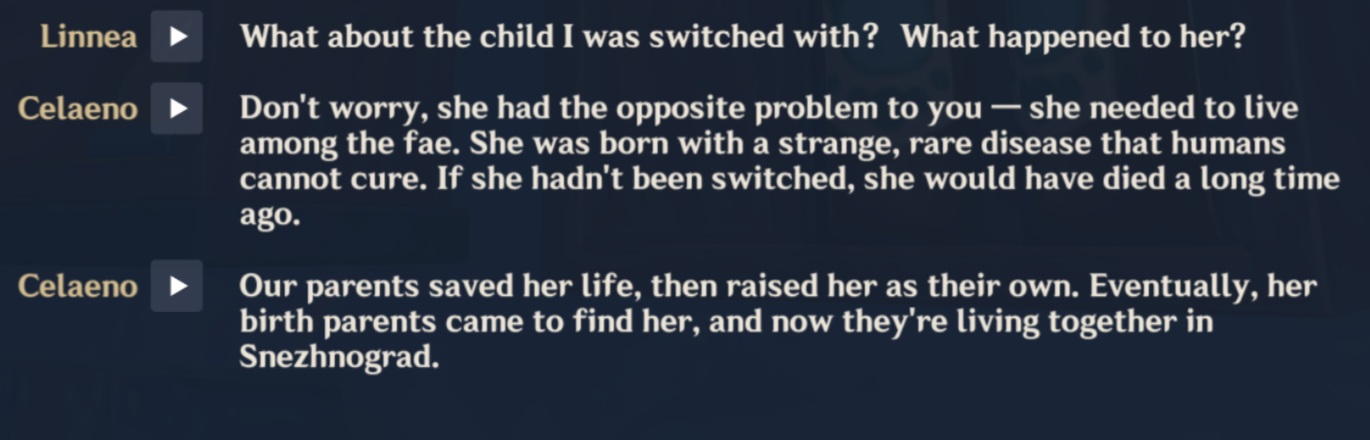 Finished Linnea's SQ.The whole thing of Fate being fixed sounds silly, when Linnea and her sister see enough details of their own fates that they could literally just choose to do something different than what they saw happen if they felt like it.Like Linnea's sister could have simply defied fate by not continuing the competition.Are fae stupid?