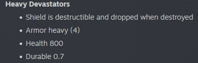 >Heavy Devastators>Shield is destructible and dropped when destroyed>Armor heavy (4)>Health 800>Durable 0.7That's nice, but I don't really fucking care when all I need is AP3 explosives or a good staggering force shot to a body part to get it to flinch and expose its torso to fire.