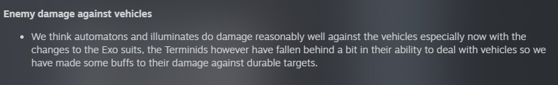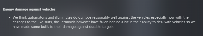 >We think automatons and illuminates do damage reasonably well against the vehicles especially now with the changes to the Exo suits, the Terminids however have fallen behind a bit in their ability to deal with vehicles so we have made some buffs to their damage against durable targets.Oh no no no