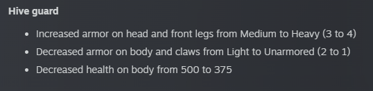 >War Strider>Leg hip joints decreased armor from Heavy to Medium (4 to 3)Finally, thank->Hive guard>Increased armor on head and front legs from Medium to Heavy (3 to 4)What the actual fuck