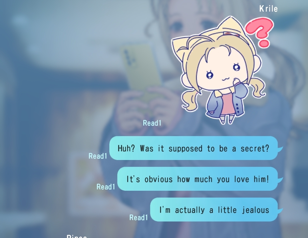 >>565116590She's texting Aerith and CLoud about their love for each other.