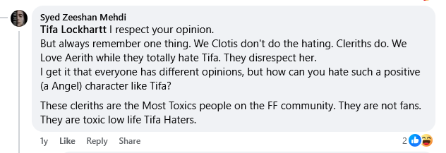 >>565321386>Why do I see Tifags being angry at Aerithfags because Tifa was censored in EC?Anon, shippers are retarded. Anything Aerith or tifa "gets" but no the other is an attack to them.The entire discourse of FFVII OG and remake is about aerith and tifa, even the "how the trilogy will end". Since i like FFVII i get a lot of FFVII in my X feed, but i also get tons of tifa/aerith shipping accounts reacting to news and all i see is garbage related to them. For example: Hamaguchi recently said that he trusts Nojima with the story and that it will end closing all the things they have built over the years. Do you think they care if Advent children still goes after remake or it is a new ending? No, when ClotiqT19 writes "yes, we trust nojima and hamaguchi, stop questioning devs!" it is because that implies Cloud ending up with Tifa.These people are sick.