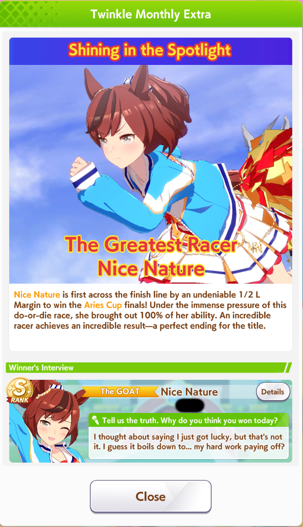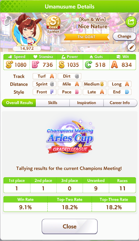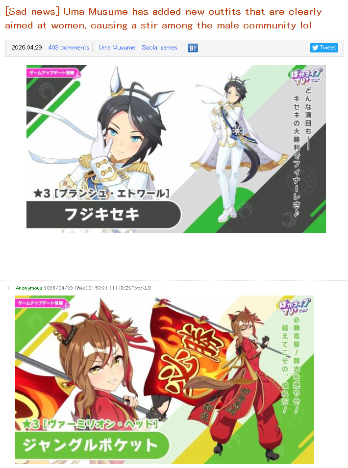 Previous: >>565170901>Global Game NewsLink your account to Cygames iDCurrent Scenario: Make A New Track aka "Trackblazer"Current Rate Up: Yaeno Muteki (3*), Cheerleader Nice Nature (3*), Cheerleader King Halo (3*), SSR Twin Turbo (Speed), SSR Ines Fujin (Guts), SSR Bamboo Memory (Guts), SSR Seeking the Pearl (Speed)Current CM: Taurus Cup - Tokyo Turf 2400m Medium/Left/Spring/FirmCurrent Event: Tracen Cheer Squad, Goldshi Week>Schedule04/30 - Ines Fujin (3*), MR. C.B. (SSR), Tokai Teio (SR)https://pages.snep.pw/uma/anni-skill-changes>JP Game NewsCurrent Rate Up: Admire Groove (3*), (SSR) Tokai Teio, Almond Eye, Eishin Flash, Dream Journey, Calstone Light O, Curren Bouquetd'or, Mihono Bourbon, Tamamo Cross, Stay Gold, Daiichi RubyNew Scenario "Beyond Dreams" releasedTimeline: https://uma.moe/timelineCygames Webstore: https://webstore.cygames.com/en/umamusume_en>Thread Clubshttps://rentry.co/umaglobalclublistYou must be E3 (20k points) to join a circle. Apply with /uma/ or /vg/ in your profile or post ID in the thread.>All Guides & Resourceshttps://rentry.org/uma26Game databasehttps://gametora.com/umamusume (Click the gear to switch between JP / global server info)A basic guide for newfagshttps://rentry.org/umaglobalFind networks if your region is blocked from the game or clienthttps://www.umavpn.topSeiyuu & Concertshttps://rentry.org/umstUmamusume Birthday Calendarhttps://ウマ娘.攻略.tools/events/birthdayUma Texthttps://umareader.idsmile.xyzCustom Stickershttps://schizo.farm/resources/stickersFind borrowshttps://chronogenesis.net/friend_search