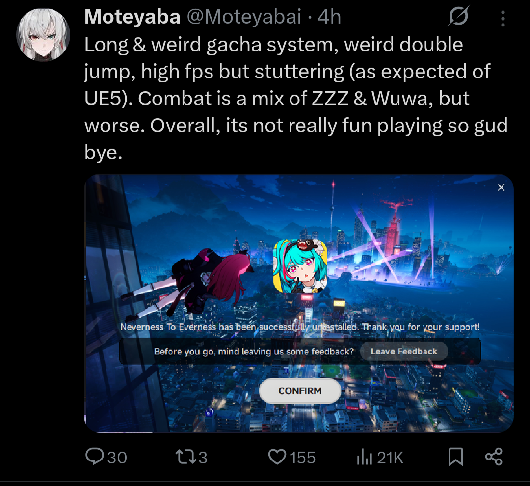 Like seriously playing the story in this game feels like playing a typical HSR (minus the turn-based combat, it being open world + being able to jump) going from WuWa to this feels like such a downgrade story presentation wise. They're on Unreal Engine 5 and THIS is the best they can do?