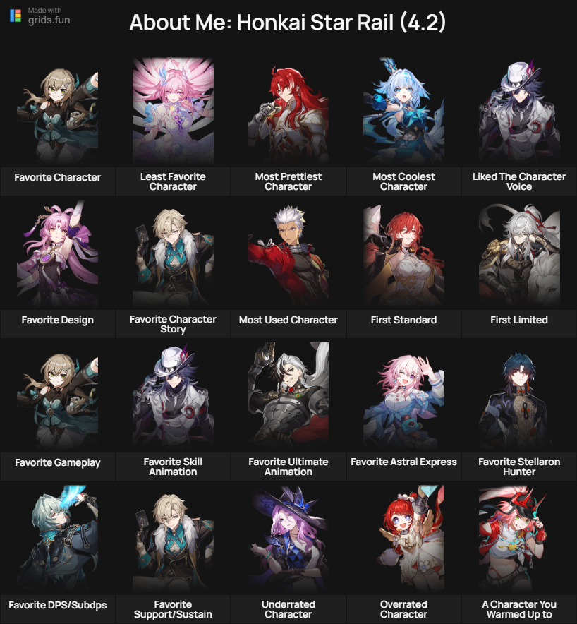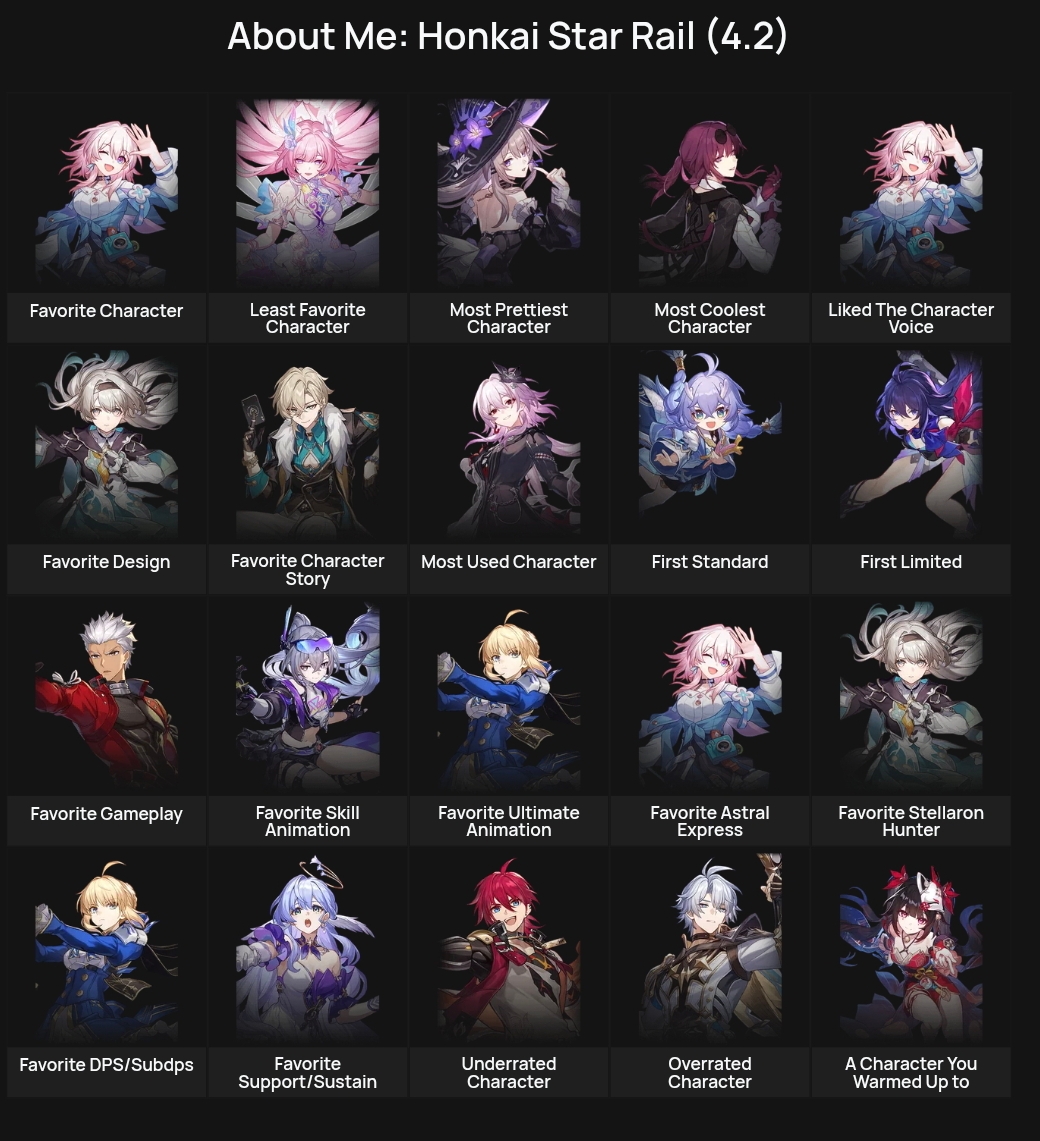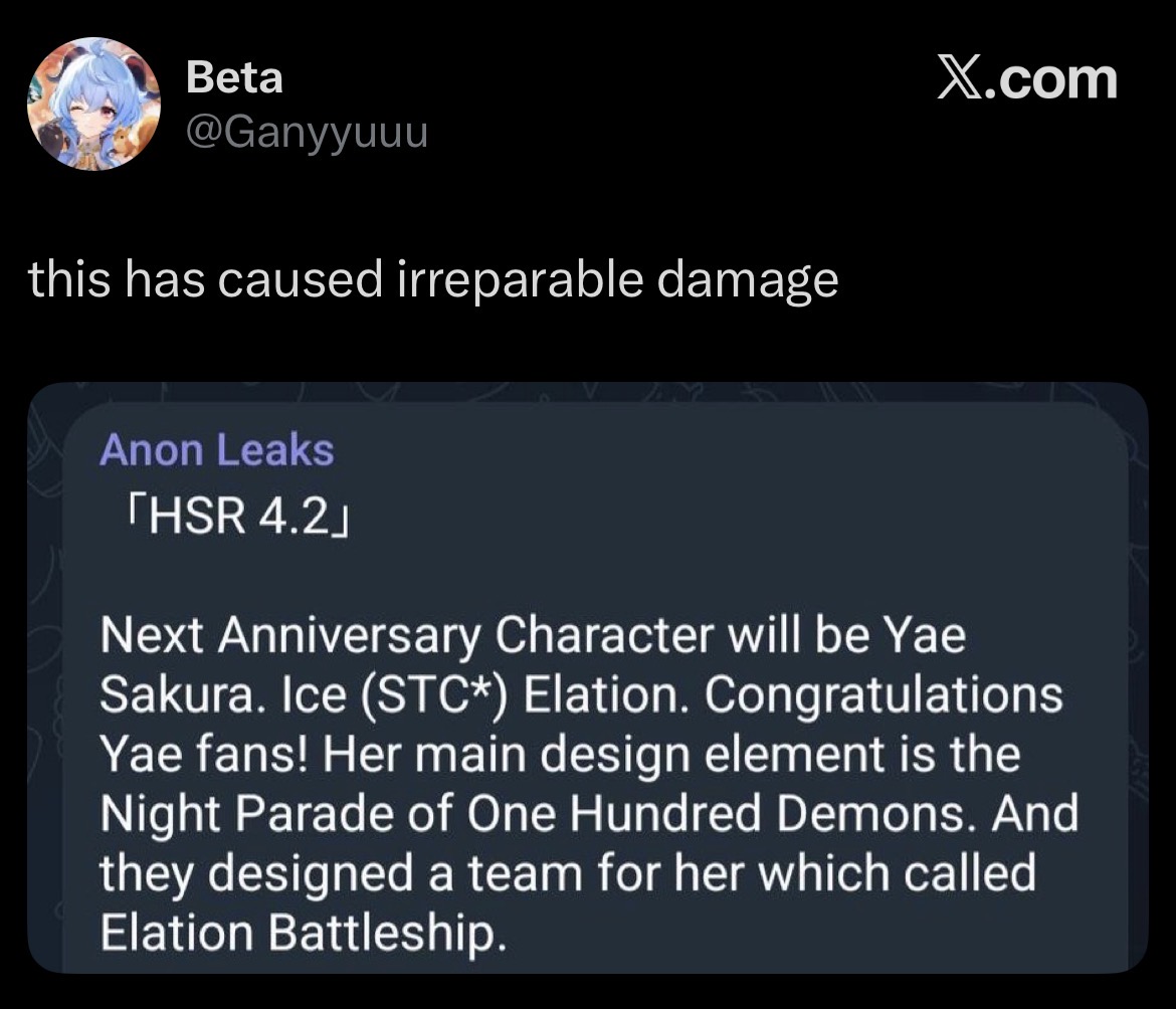 Previous: >>565289060>"2026 Star Rail's Marvelous Night" Online Concert will be livestreamed on May 3 at 19:00 (UTC+8)https://www.youtube.com/watch?v=OjOTRqM_3bohttps://www.youtube.com/watch?v=3oUx5JEERE0>Download - https://hsr.hoyoverse.com/en-us/home>4.2 Preview Page - https://act.hoyoverse.com/puzzle/hkrpg/e20260410version_1370/index.html>Version 4.2 Trailer: "So Laughed the Masses"https://www.youtube.com/watch?v=NyM_seY0XKghttps://www.youtube.com/watch?v=QaHPMkksn3U>Silver Wolf LV.999 Character Trailer: "Solo Maxxing"https://www.youtube.com/watch?v=va-4BypzDQohttps://www.youtube.com/watch?v=LkxwwIyXJxE>3rd Anniversary Theme Song: "Side Quest King"https://www.youtube.com/watch?v=jgtPZdB9cWAhttps://www.youtube.com/watch?v=Ndis7_as3vg>Honkai: Star Rail x MAPPA Animation Concept Trailerhttps://www.youtube.com/watch?v=j6e_4OYVbxchttps://www.youtube.com/watch?v=KM7KoZM9wKE>Improv Tour Trailer: "Beginner's Guide"https://www.youtube.com/watch?v=FArOcK-HzXohttps://www.youtube.com/watch?v=NEn6umYiiU8>Myriad Celestia Trailer — "Scene 999: GAME NOT OVER"https://www.youtube.com/watch?v=paFelc1vM1khttps://www.youtube.com/watch?v=k9rCUlWO6y8>Animated Short: "Is This Game Even Playable?"https://www.youtube.com/watch?v=GMY_N6ca3Ighttps://www.youtube.com/watch?v=7TK9bTfoRZo>Current Character Banners: Silver Wolf LV.999, The Dahlia, Castorice, Firefly + Gallagher, Xueyi, Hook - https://www.hoyolab.com/article/44733121>New Drip Marketing:>Mortenax Blade (5* Fire Nihility) - https://www.hoyolab.com/article/44526609>Redeemable Codes - https://hsr.hoyoverse.com/giftEB28LCJRU4W3STARRAILGIFT>/hsrg/ Tools & Resourceshttps://rentry.org/hsrg-resources-14>/hsrg/ Thread Templatehttps://rentry.org/hsrg-thread-template-14