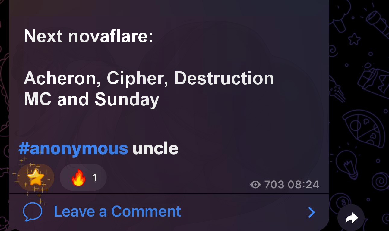 honestly herta and cipher are the only 3.x characters that would already need a novaflare, mostly because they got unfairly shaftedherta got a restrictive passive and no proper support that makes it worth it, so she is gimped with 1 less useful slot in the team in a patch cycle where the top dps actually have an extra slot(castorice getting buffed by sustain, phainon not needing a sustain)cipher got shafted because some inexperienced dev panicked after the dps showcases and slashed her numbers while forgetting to compensate for them in some way