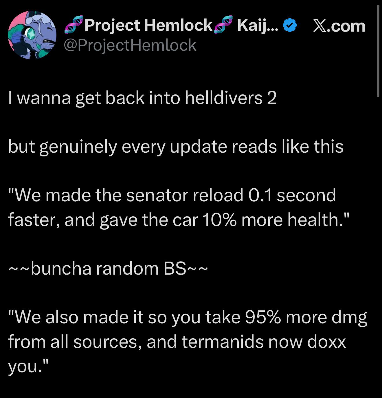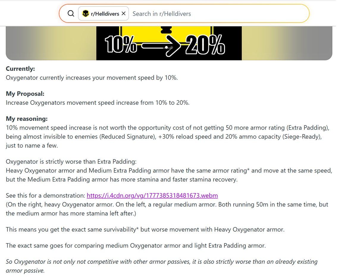 >>565314323I bet it's as simple as>buff the mechs>test it on d6 for a bit >oh wow I got swarmed and they did fuck all, that's not intended>ehh give the chaff durability damage because we don't want to hurt the mech in the mech warbond & we want the mech to feel powerful>oh that's going to offset the mech health.>give it like 400 more health the mech is still powerful, it's just that getting swarmed eats shit. >the acid damgethis is fucking baffling though. I assume they tanked a couple bilespewers full on and thought that was too much in testing so just overnerfed it. >>565314556yeah it's fucking weird that theres mutlitple unarmoured states, one heavy and one medium and then 5~? tank armour states. I wonder if they spent so much time on that in the design phases, implemented it and realised way, way too late that it's not necessary but it's already fundamental.