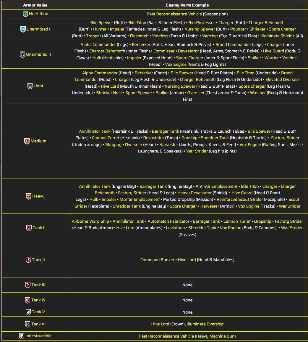 >>565318546only eagles and orbital projectiles have gradually lower penetration with angle. every other weapon only cares about the extreme angle hit, which is obvious on its face and shouldn't need explaining because of course hitting a target at a near parallel angle is going to see the bullet skid offthey've even made the system less complicated over time. many weapons did used to have various penetration values based on imapct angle beyond the extreme angle hit, but they were all standardized. except the patriot rockets which is the last hold out of the old system.